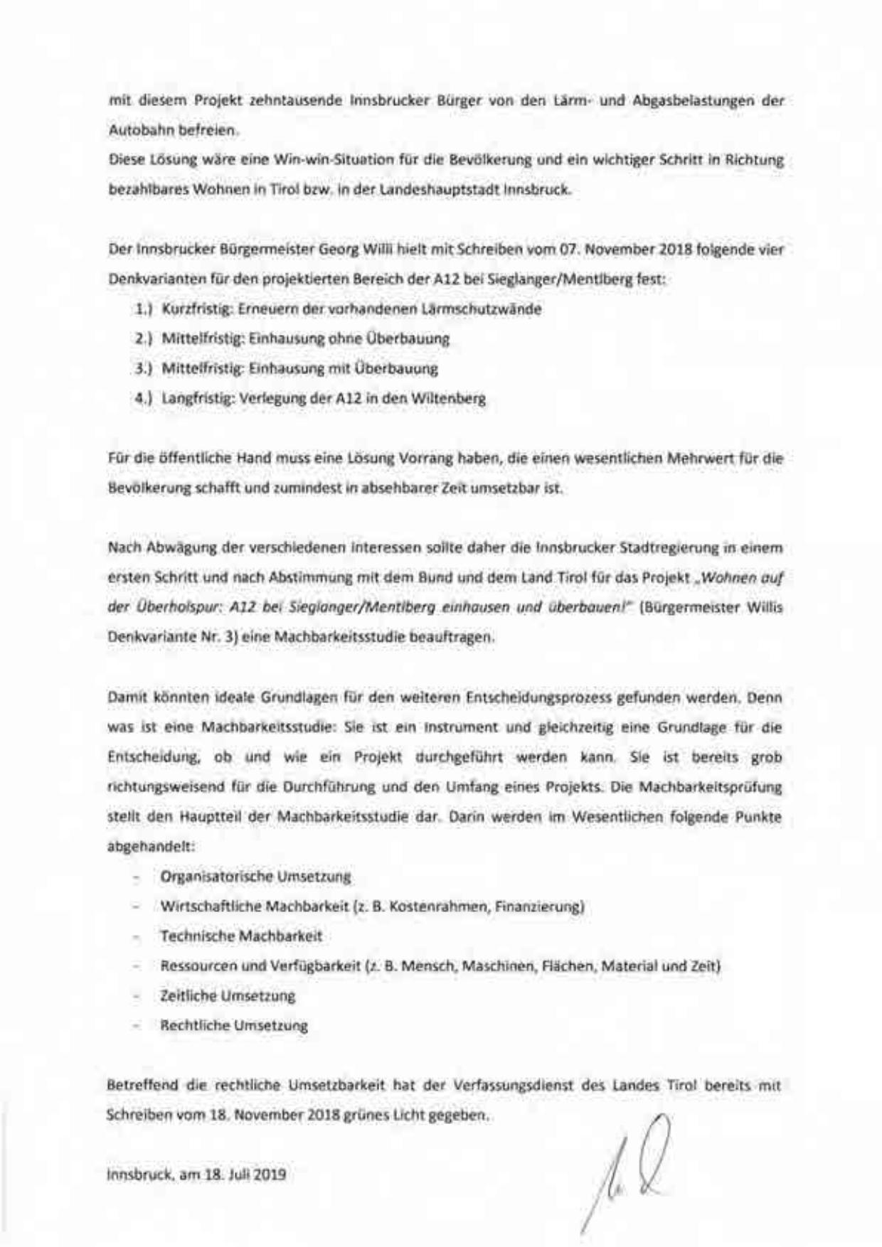 Der lnnsbrucker Bürgermeister Georg Willi hielt mit Schreiben vom 07. November 2018 folgende vier