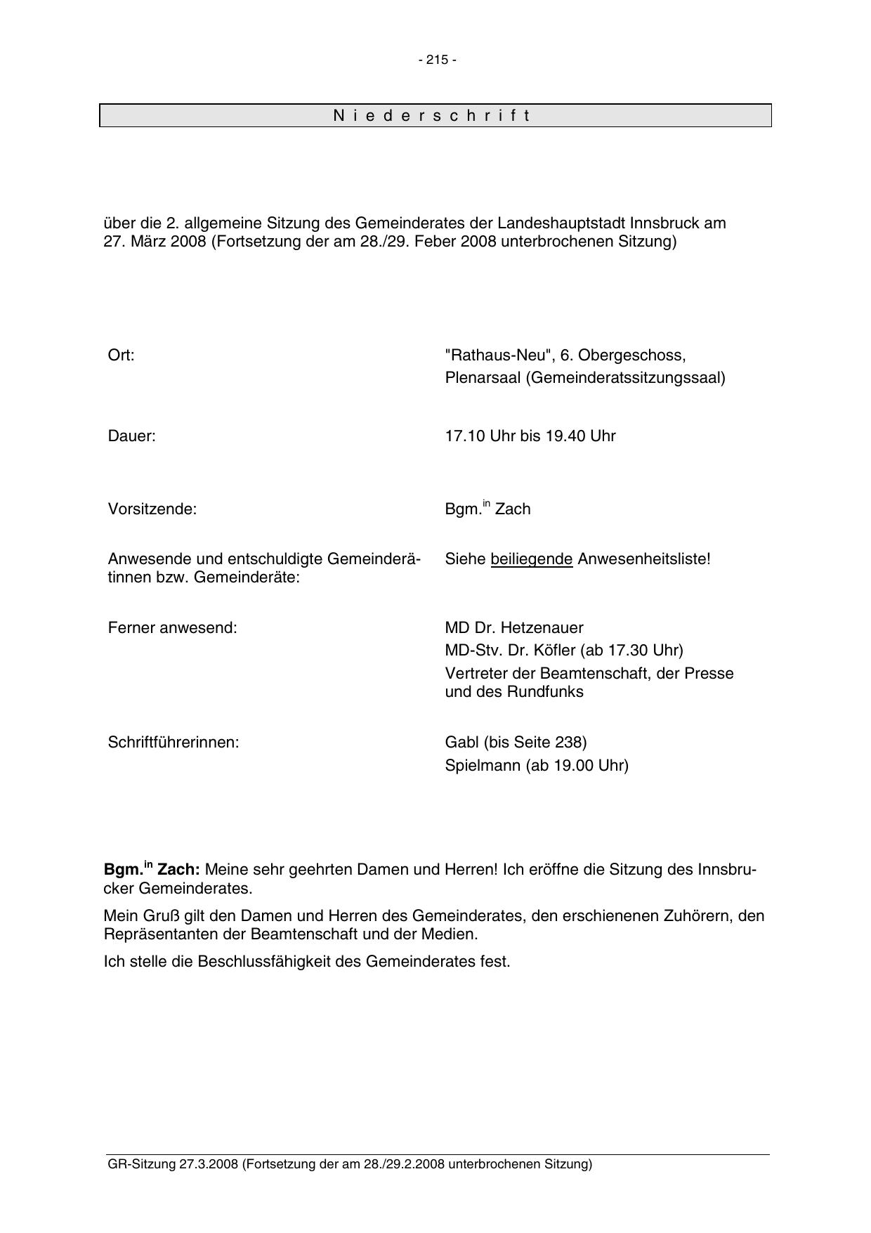 Bgm.in Zach: Meine sehr geehrten Damen und Herren! Ich eröffne die Sitzung des Innsbrucker Gemeinderates.
