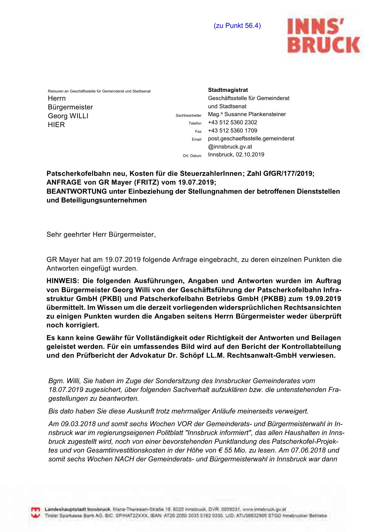 Patscherkofelbahn neu, Kosten für die SteuerzahlerInnen; Zahl GfGR/177/2019;