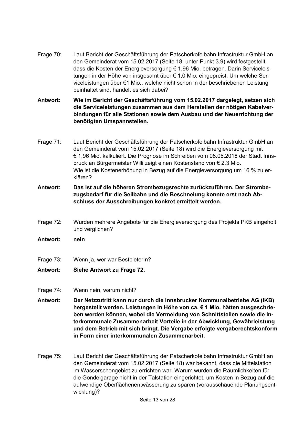 € 1,96 Mio. kalkuliert. Die Prognose im Schreiben vom 08.06.2018 der Stadt Innsbruck an Bürgermeister Willi zeigt einen Kostenstand von € 2,3 Mio.