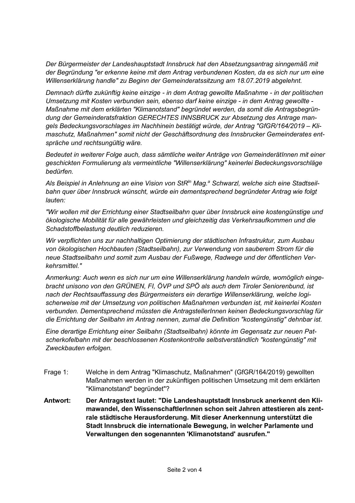 Umsetzung mit Kosten verbunden sein, ebenso darf keine einzige - in dem Antrag gewollte Maßnahme mit dem erklärten "Klimanotstand" begründet werden, da somit die Antragsbegründung der Gemeinderatsfraktion GERECHTES INNSBRUCK zur Absetzung des Antrage mangels Bedeckungsvorschlages im Nachhinein bestätigt würde, der Antrag "GfGR/164/2019 – Klimaschutz, Maßnahmen" somit nicht der Geschäftsordnung des Innsbrucker Gemeinderates entspräche und rechtsungültig wäre.