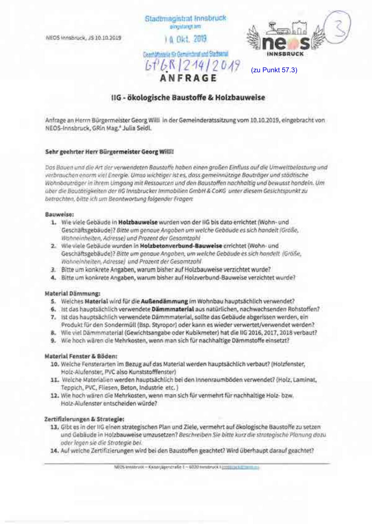 Anfrage an Herrn Bürgermeister Georg Willi in der Gemeinderatssitzung vom 10.10.2019, eingebracht von