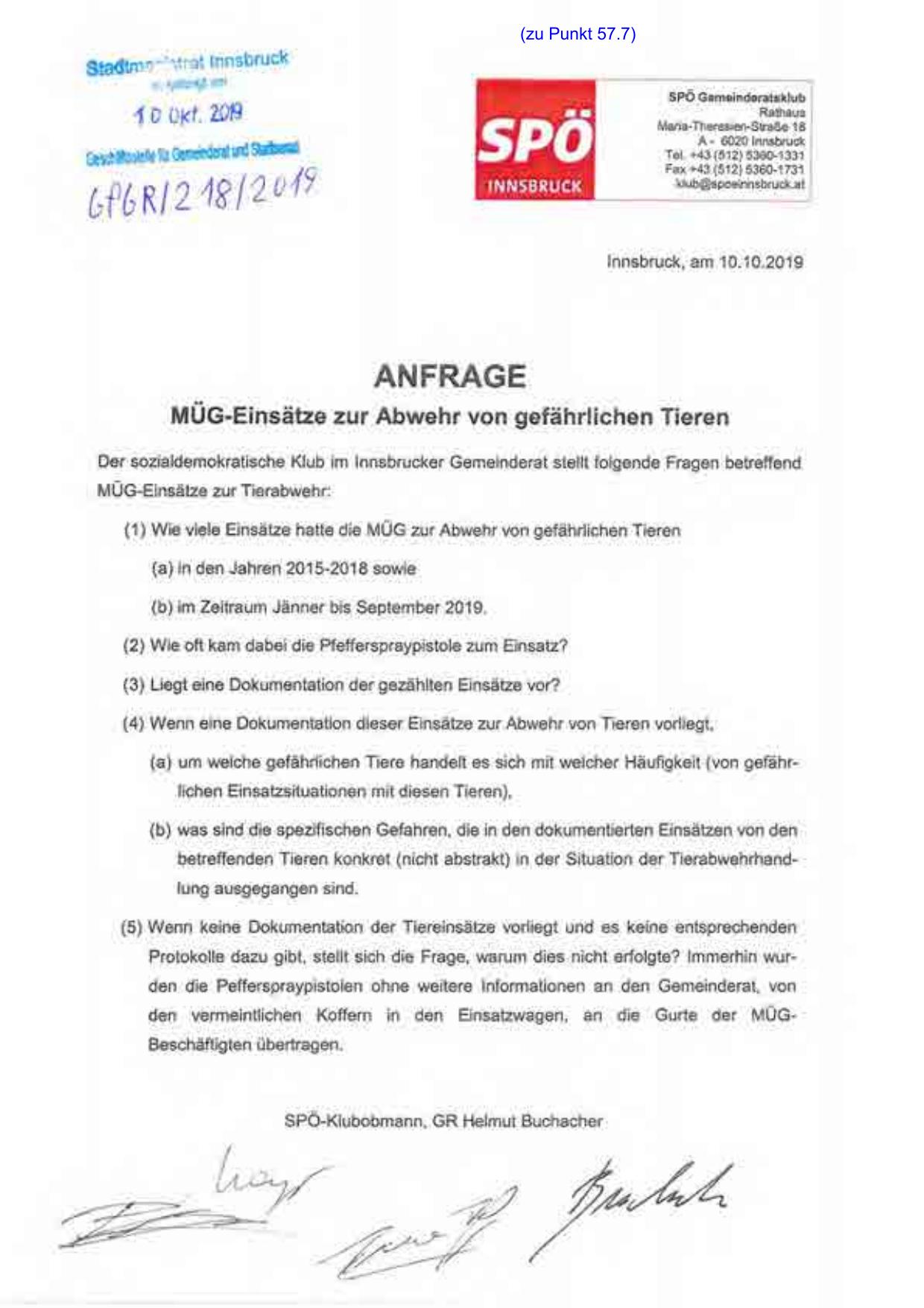 Der sozialdemokratische Klub im lnnsbrucker Gemeinderat stellt folgende Fragen betreffend