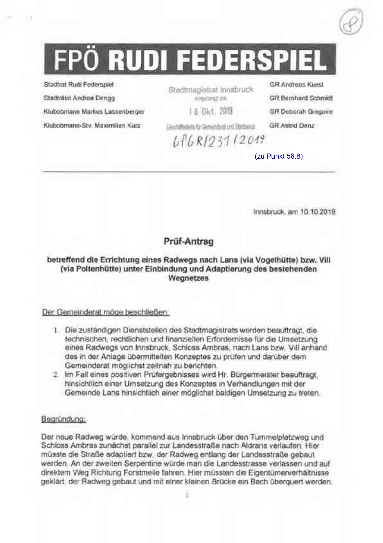 betreffend die Errichtung eines Radwegs nach Lans (via Vogelhütte) bzw. Vill