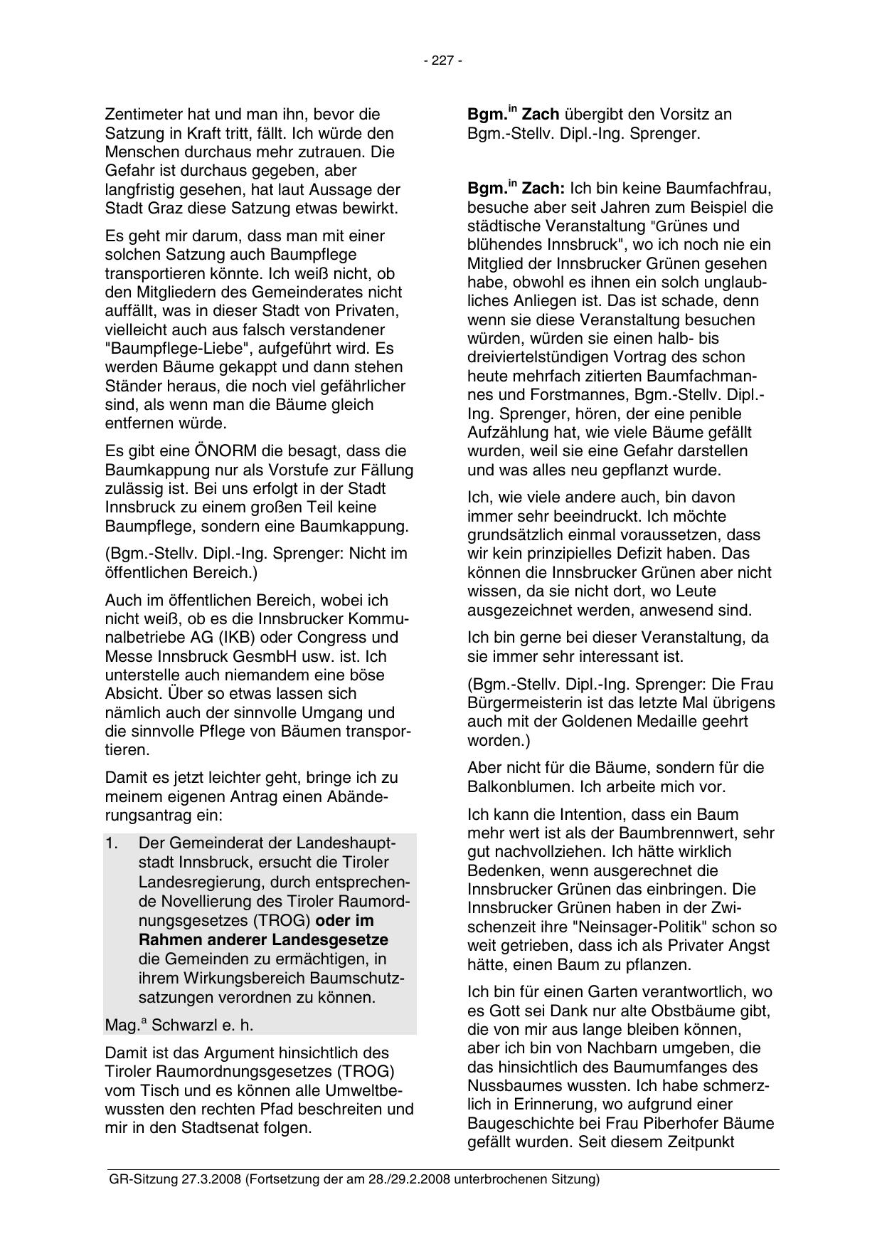 heute mehrfach zitierten Baumfachmannes und Forstmannes, Bgm.-Stellv. Dipl.Ing. Sprenger, hören, der eine penible