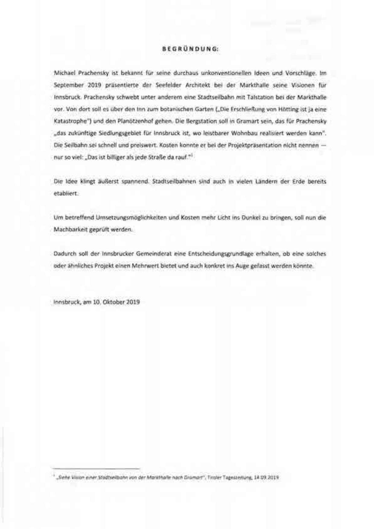 1 „Siehe Vision einer Stadtseilbahn von der Markthalle nach Gramart", Tiroler Tageszeitung, 14.09.2019