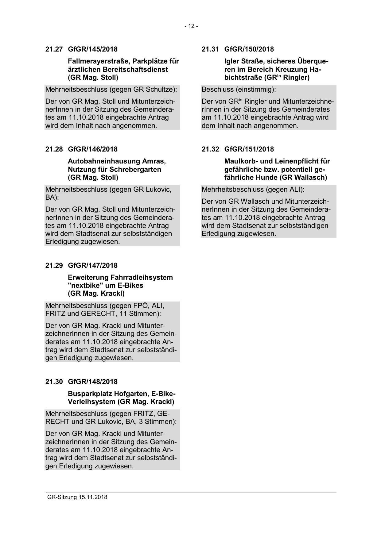 Der von GR Mag. Stoll und MitunterzeichnerInnen in der Sitzung des Gemeinderates am 11.10.2018 eingebrachte Antrag