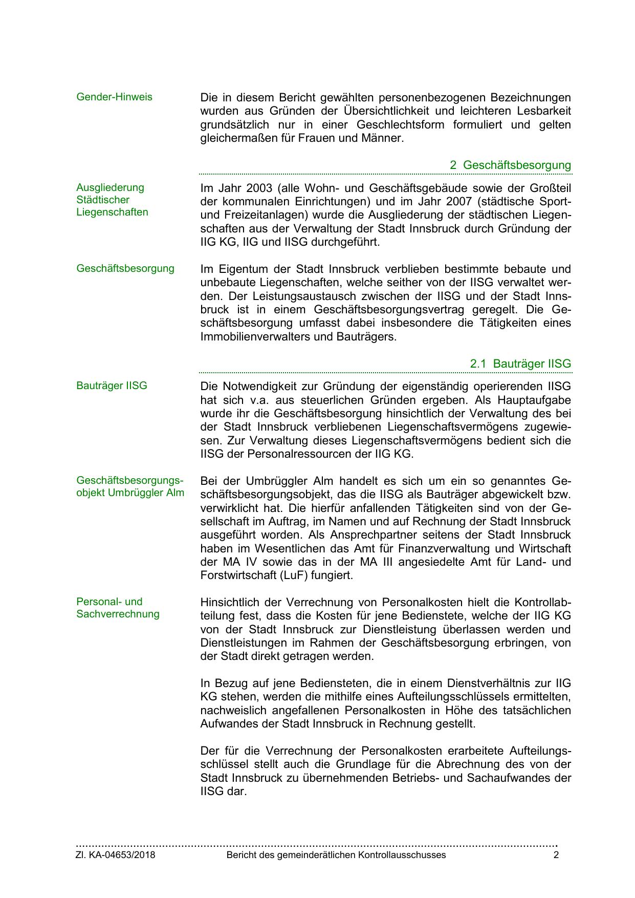 unbebaute Liegenschaften, welche seither von der IISG verwaltet werden. Der Leistungsaustausch zwischen der IISG und der Stadt Innsbruck ist in einem Geschäftsbesorgungsvertrag geregelt. Die Geschäftsbesorgung umfasst dabei insbesondere die Tätigkeiten eines