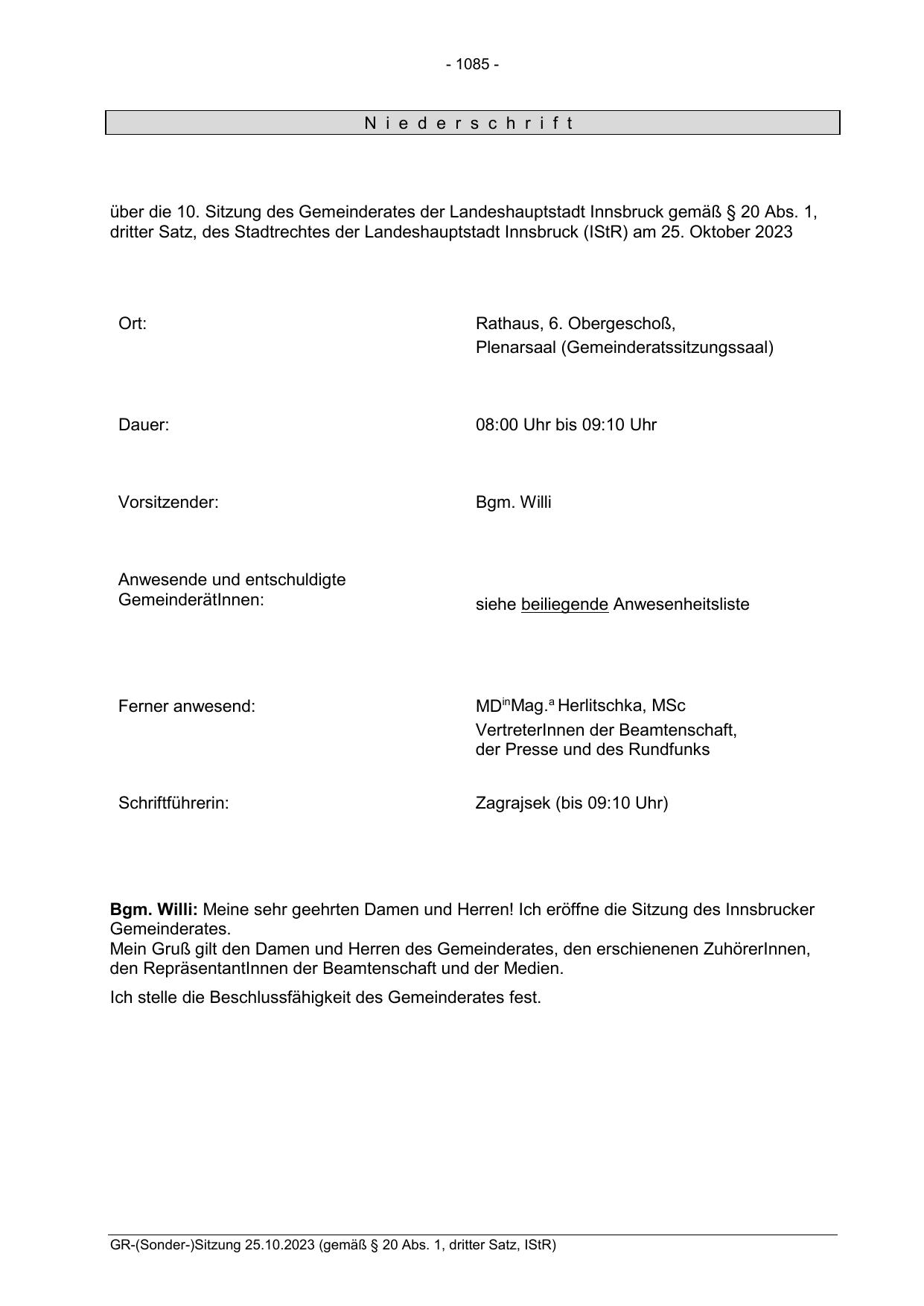 Bgm. Willi: Meine sehr geehrten Damen und Herren! Ich eröffne die Sitzung des Innsbrucker