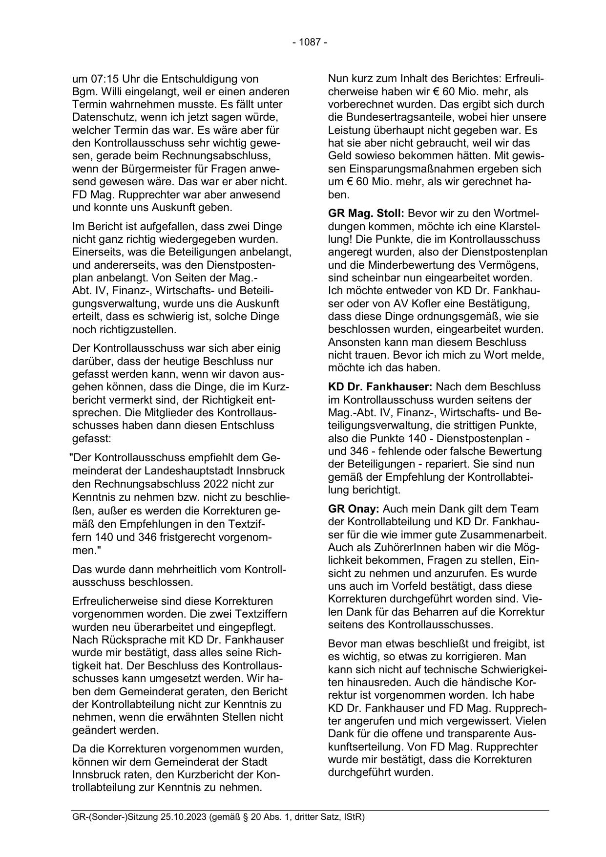 "Der Kontrollausschuss empfiehlt dem Gemeinderat der Landeshauptstadt Innsbruck