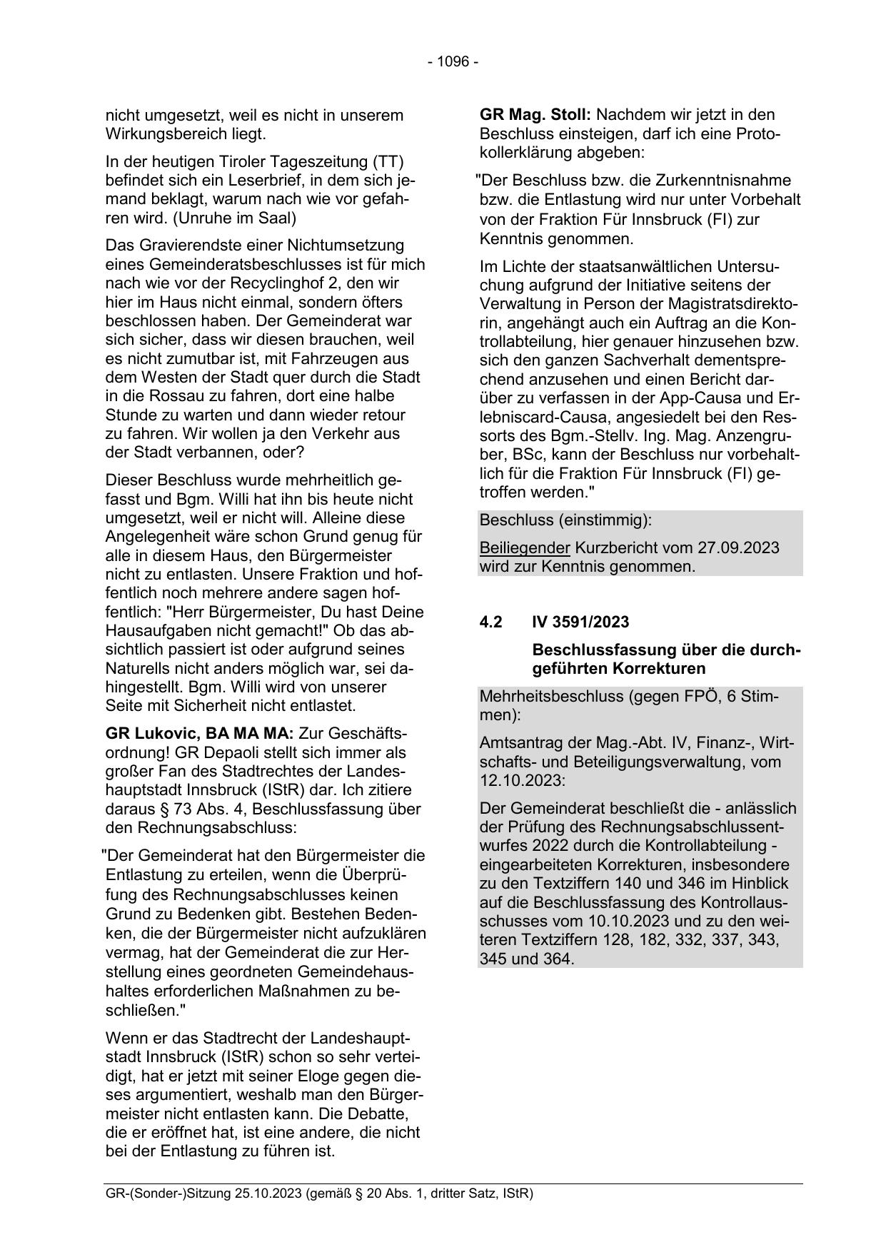 Wenn er das Stadtrecht der Landeshauptstadt Innsbruck (IStR) schon so sehr verteidigt, hat er jetzt mit seiner Eloge gegen dieses argumentiert, weshalb man den Bürgermeister nicht entlasten kann. Die Debatte,