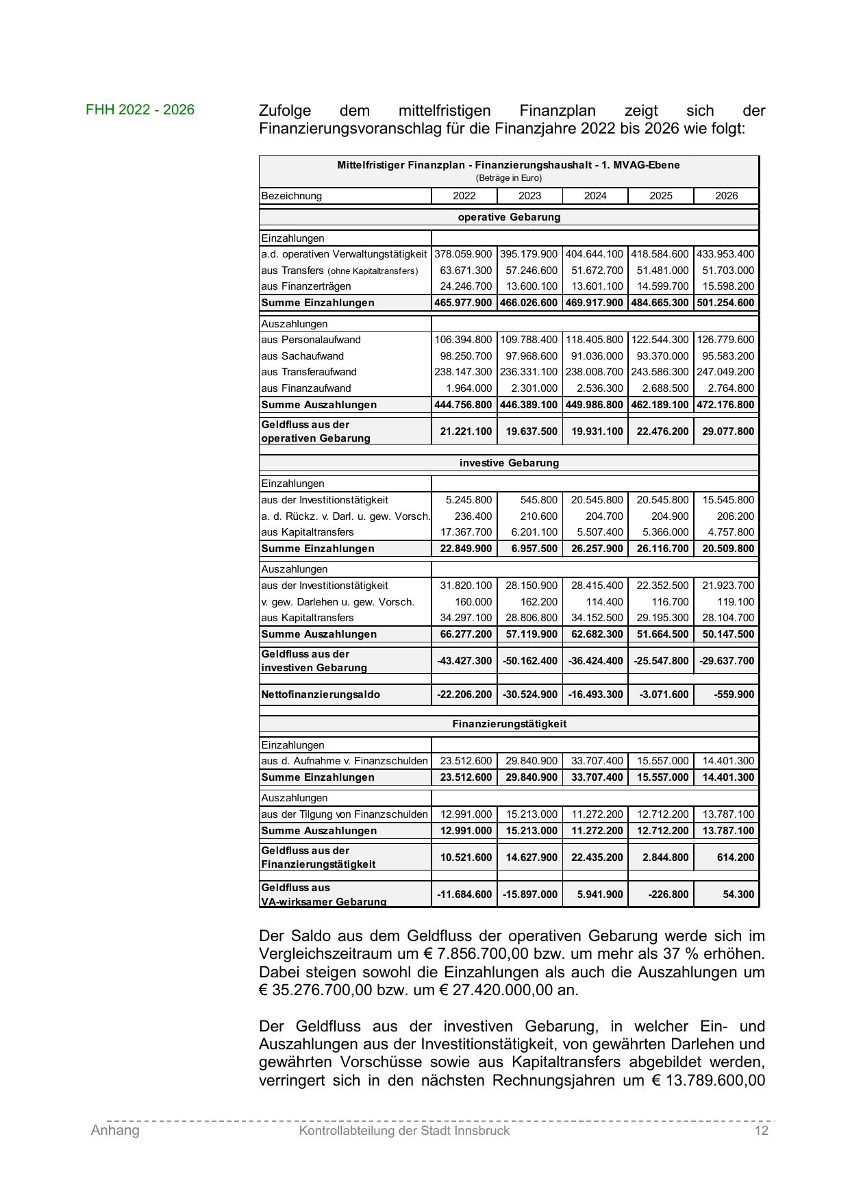 Finanzierungsvoranschlag für die Finanzjahre 2022 bis 2026 wie folgt: