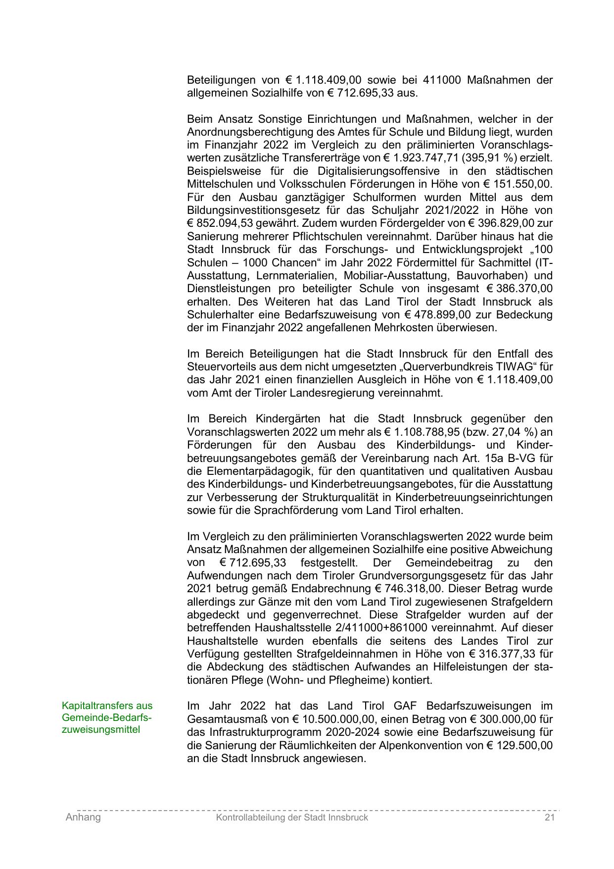 im Finanzjahr 2022 im Vergleich zu den präliminierten Voranschlagswerten zusätzliche Transfererträge von € 1.923.747,71 (395,91 %) erzielt.