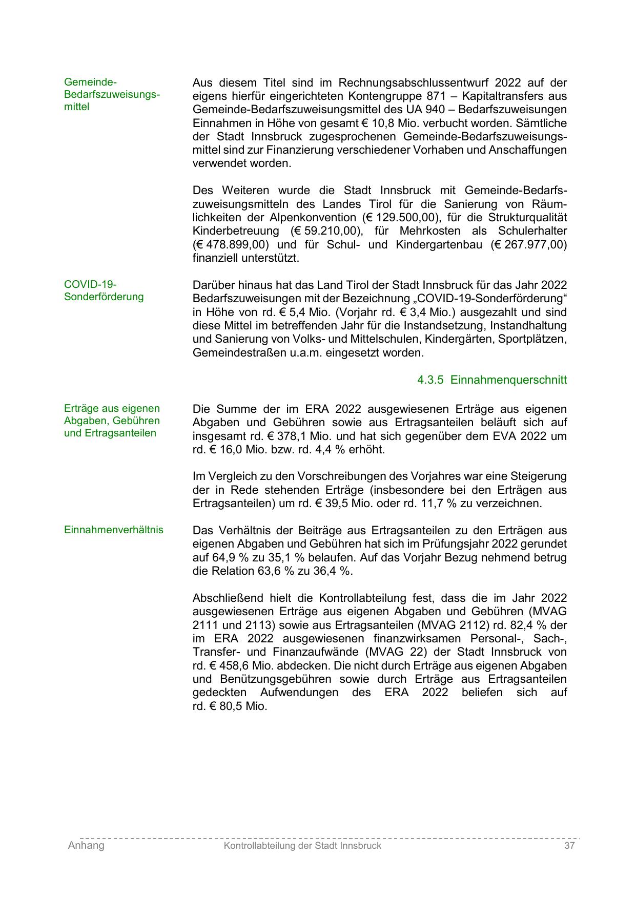 Des Weiteren wurde die Stadt Innsbruck mit Gemeinde-Bedarfszuweisungsmitteln des Landes Tirol für die Sanierung von Räumlichkeiten der Alpenkonvention (€ 129.500,00), für die Strukturqualität