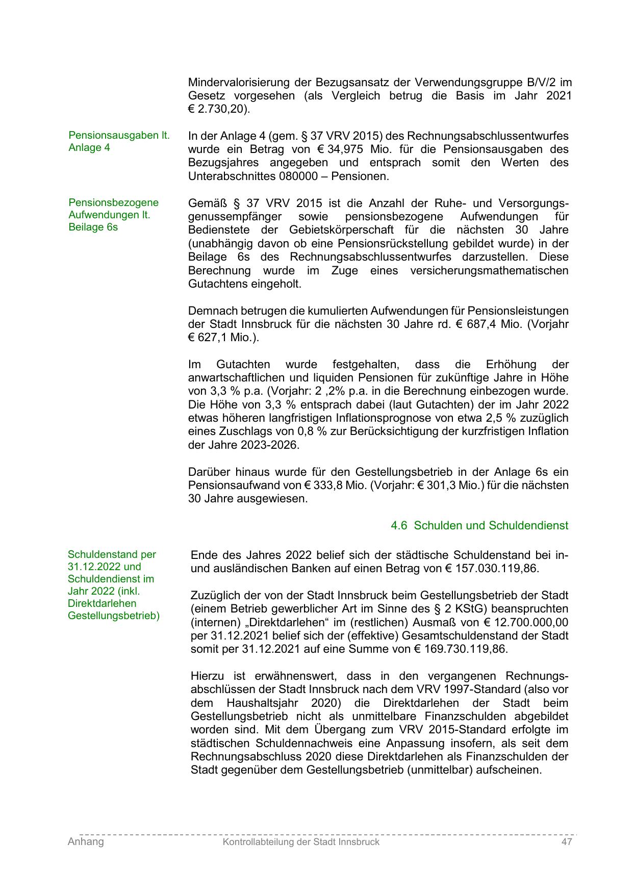 Hierzu ist erwähnenswert, dass in den vergangenen Rechnungsabschlüssen der Stadt Innsbruck nach dem VRV 1997-Standard (also vor