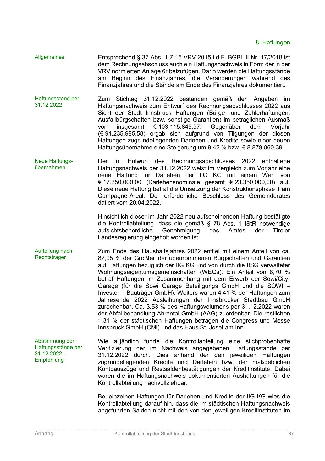 Sicht der Stadt Innsbruck Haftungen (Bürge- und Zahlerhaftungen,