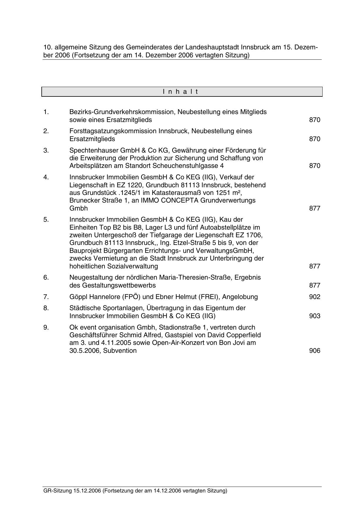 10. allgemeine Sitzung des Gemeinderates der Landeshauptstadt Innsbruck am 15. Dezember 2006 (Fortsetzung der am 14. Dezember 2006 vertagten Sitzung)