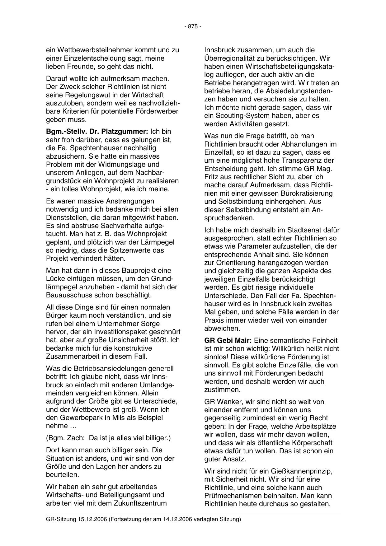 GR-Sitzung 15.12.2006 (Fortsetzung der am 14.12.2006 vertagten Sitzung)