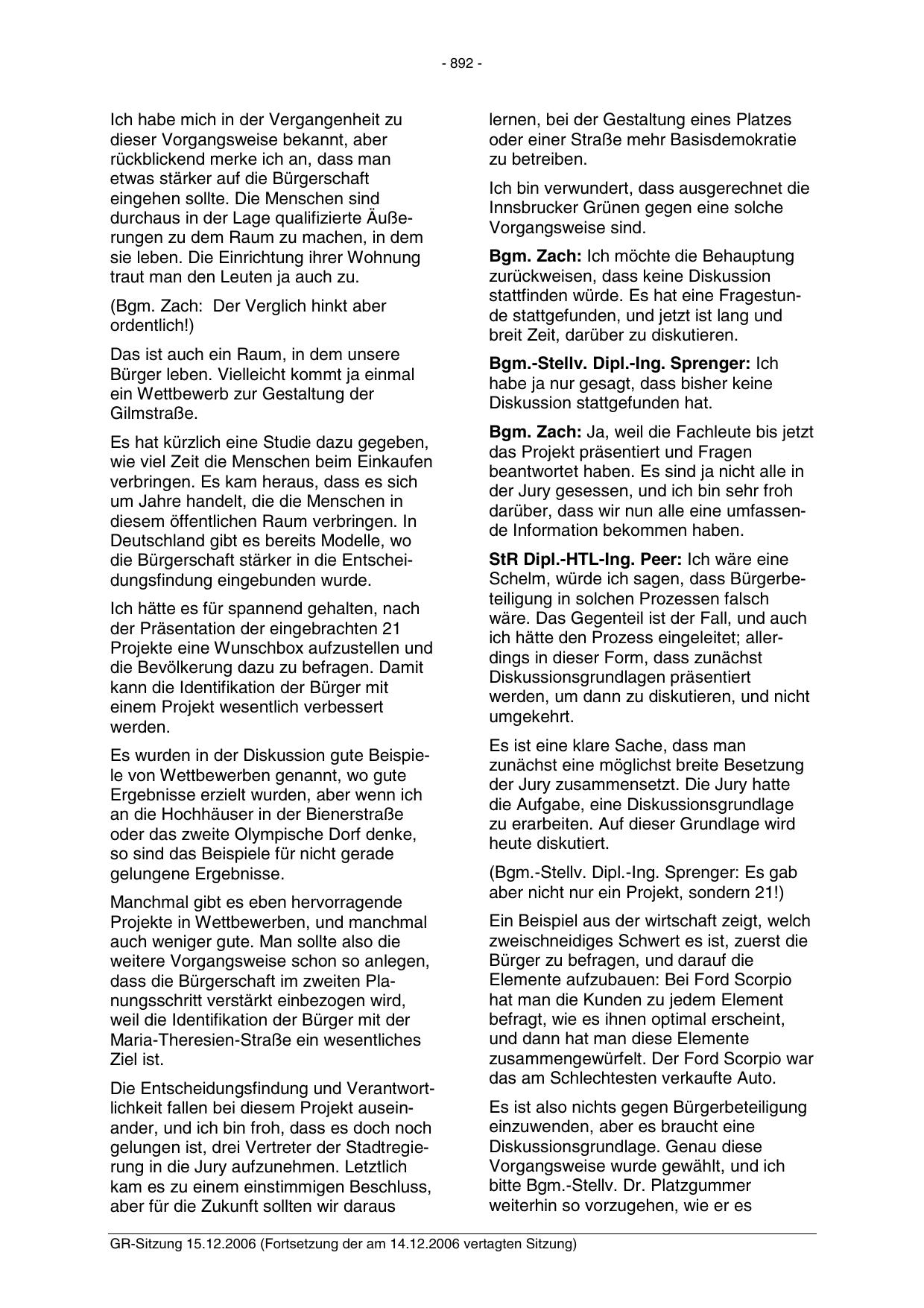 GR-Sitzung 15.12.2006 (Fortsetzung der am 14.12.2006 vertagten Sitzung)