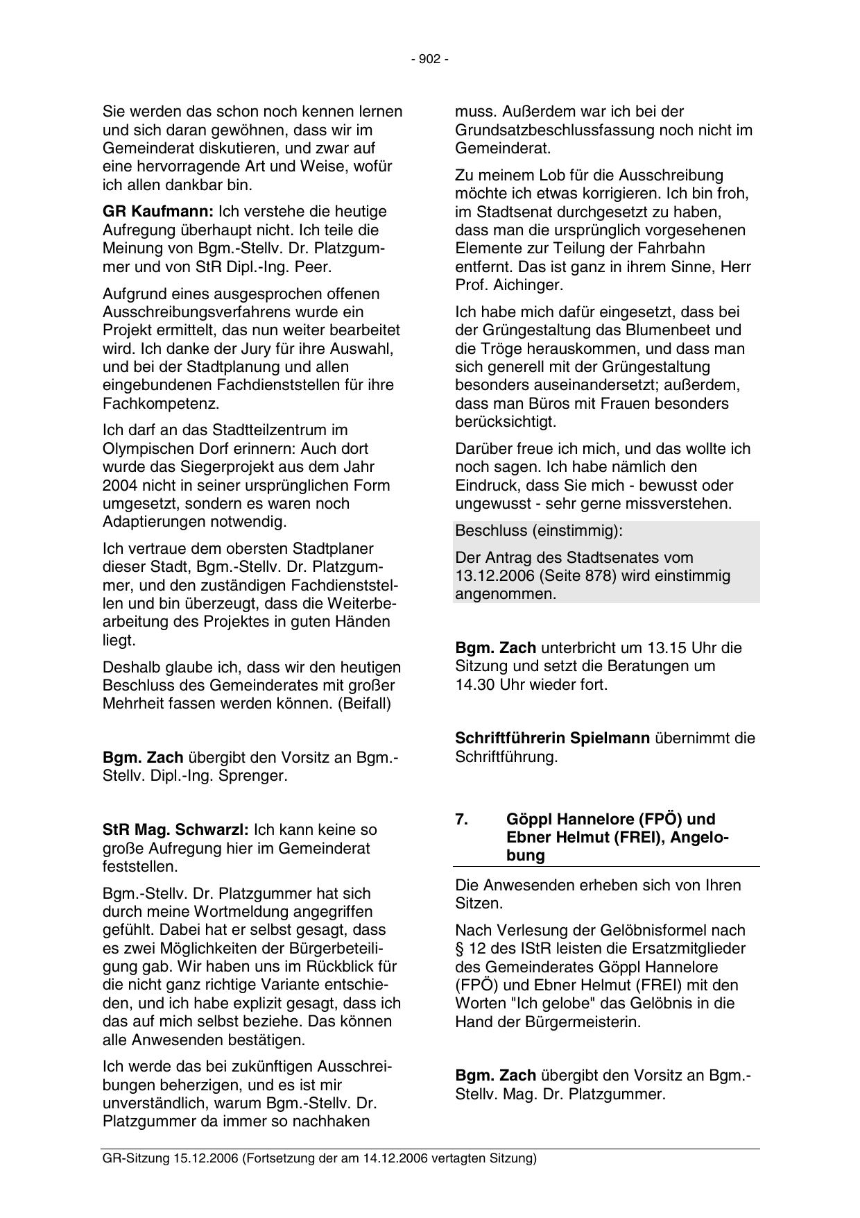 GR-Sitzung 15.12.2006 (Fortsetzung der am 14.12.2006 vertagten Sitzung)