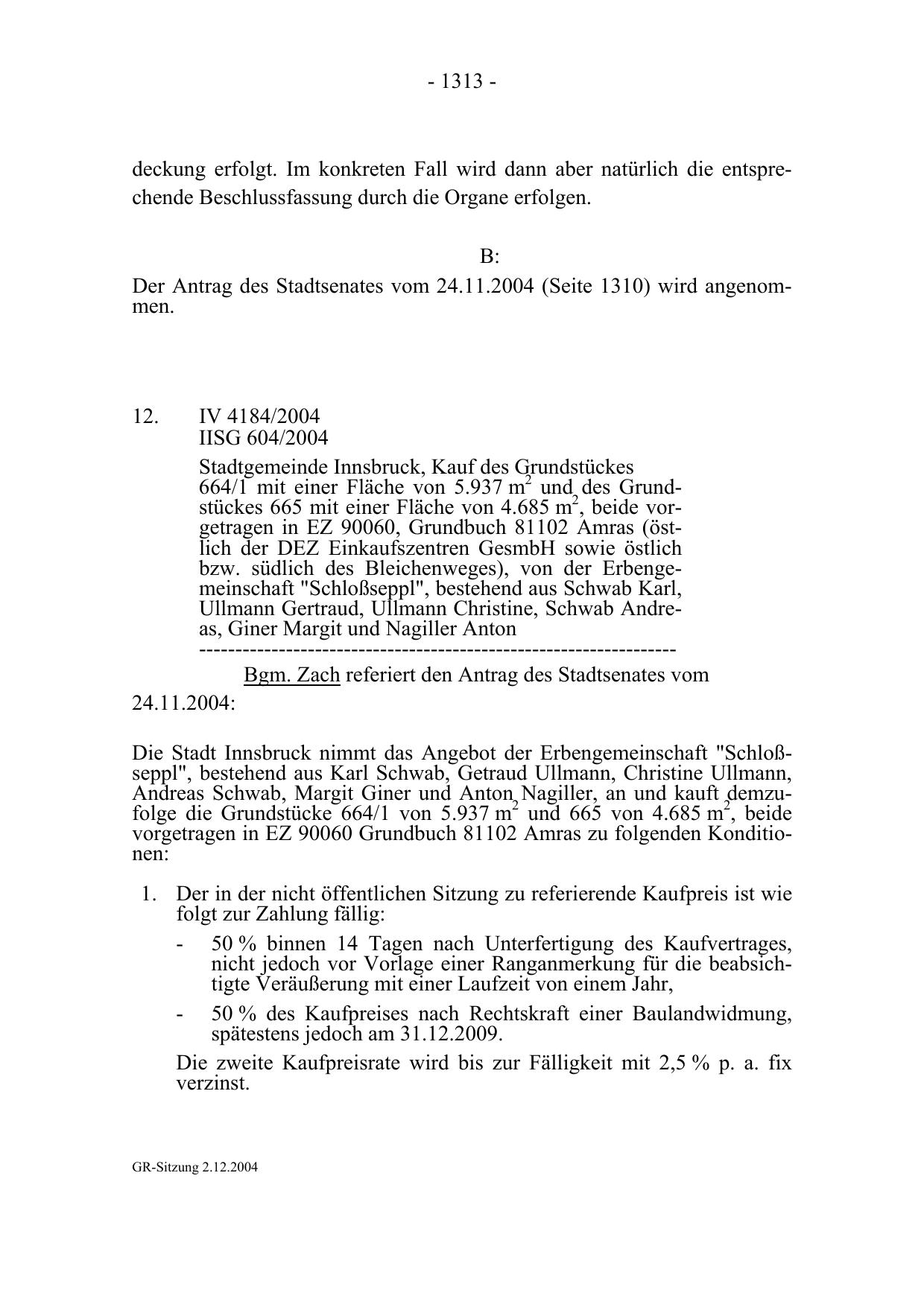 Der Antrag des Stadtsenates vom 24.11.2004 (Seite 1310) wird angenommen.