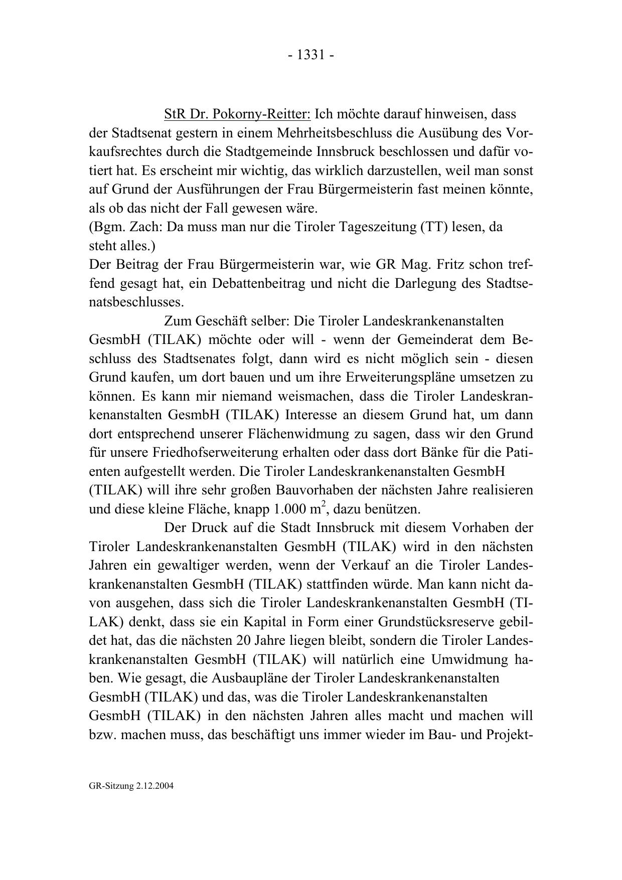 Jahren ein gewaltiger werden, wenn der Verkauf an die Tiroler Landeskrankenanstalten GesmbH (TILAK) stattfinden würde. Man kann nicht davon ausgehen, dass sich die Tiroler Landeskrankenanstalten GesmbH (TILAK) denkt, dass sie ein Kapital in Form einer Grundstücksreserve gebildet hat, das die nächsten 20 Jahre liegen bleibt, sondern die Tiroler Landeskrankenanstalten GesmbH (TILAK) will natürlich eine Umwidmung haben. Wie gesagt, die Ausbaupläne der Tiroler Landeskrankenanstalten
