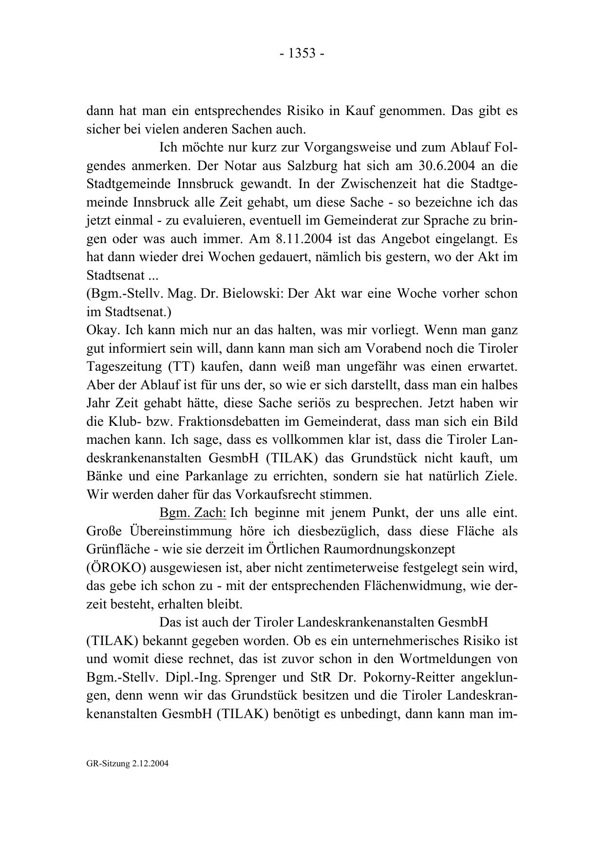 Bgm.-Stellv. Dipl.-Ing. Sprenger und StR Dr. Pokorny-Reitter angeklungen, denn wenn wir das Grundstück besitzen und die Tiroler Landeskrankenanstalten GesmbH (TILAK) benötigt es unbedingt, dann kann man im-