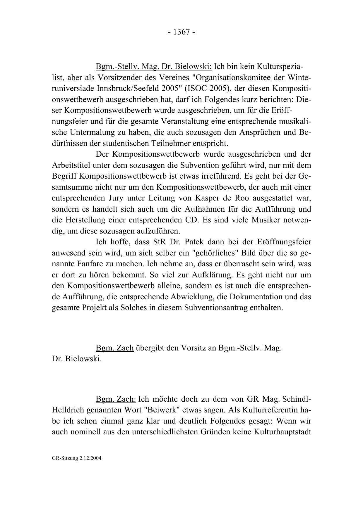 Bgm.-Stellv. Mag. Dr. Bielowski: Ich bin kein Kulturspezialist, aber als Vorsitzender des Vereines "Organisationskomitee der Winteruniversiade Innsbruck/Seefeld 2005" (ISOC 2005), der diesen Kompositionswettbewerb ausgeschrieben hat, darf ich Folgendes kurz berichten: Dieser Kompositionswettbewerb wurde ausgeschrieben, um für die Eröffnungsfeier und für die gesamte Veranstaltung eine entsprechende musikalische Untermalung zu haben, die auch sozusagen den Ansprüchen und Bedürfnissen der studentischen Teilnehmer entspricht.