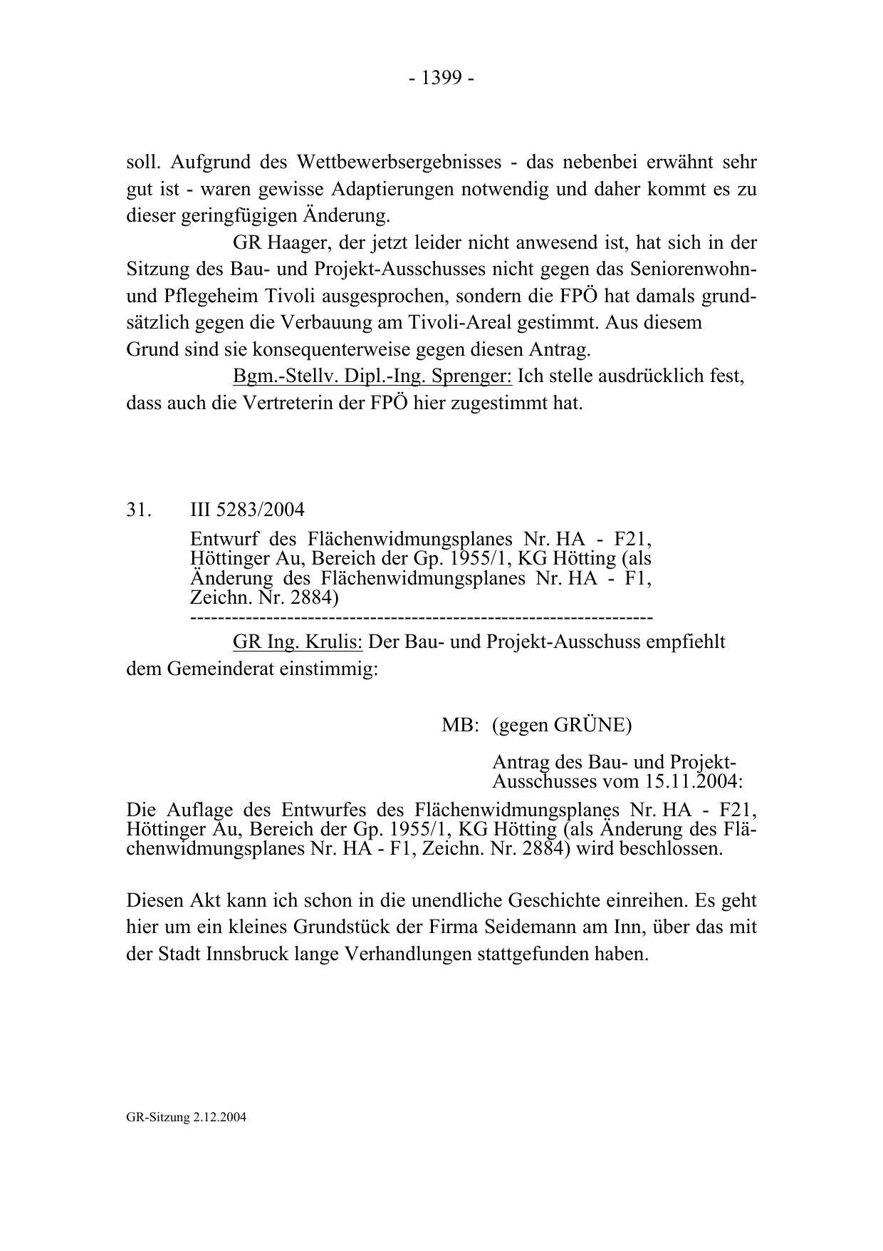 Höttinger Au, Bereich der Gp. 1955/1, KG Hötting (als Änderung des Flächenwidmungsplanes Nr. HA - F1, Zeichn. Nr. 2884) wird beschlossen.