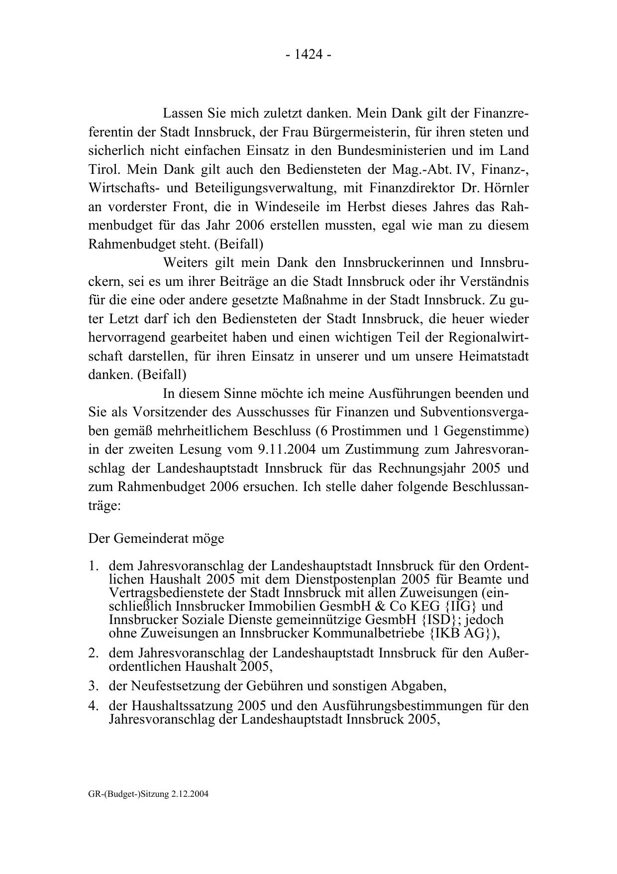 in der zweiten Lesung vom 9.11.2004 um Zustimmung zum Jahresvoranschlag der Landeshauptstadt Innsbruck für das Rechnungsjahr 2005 und