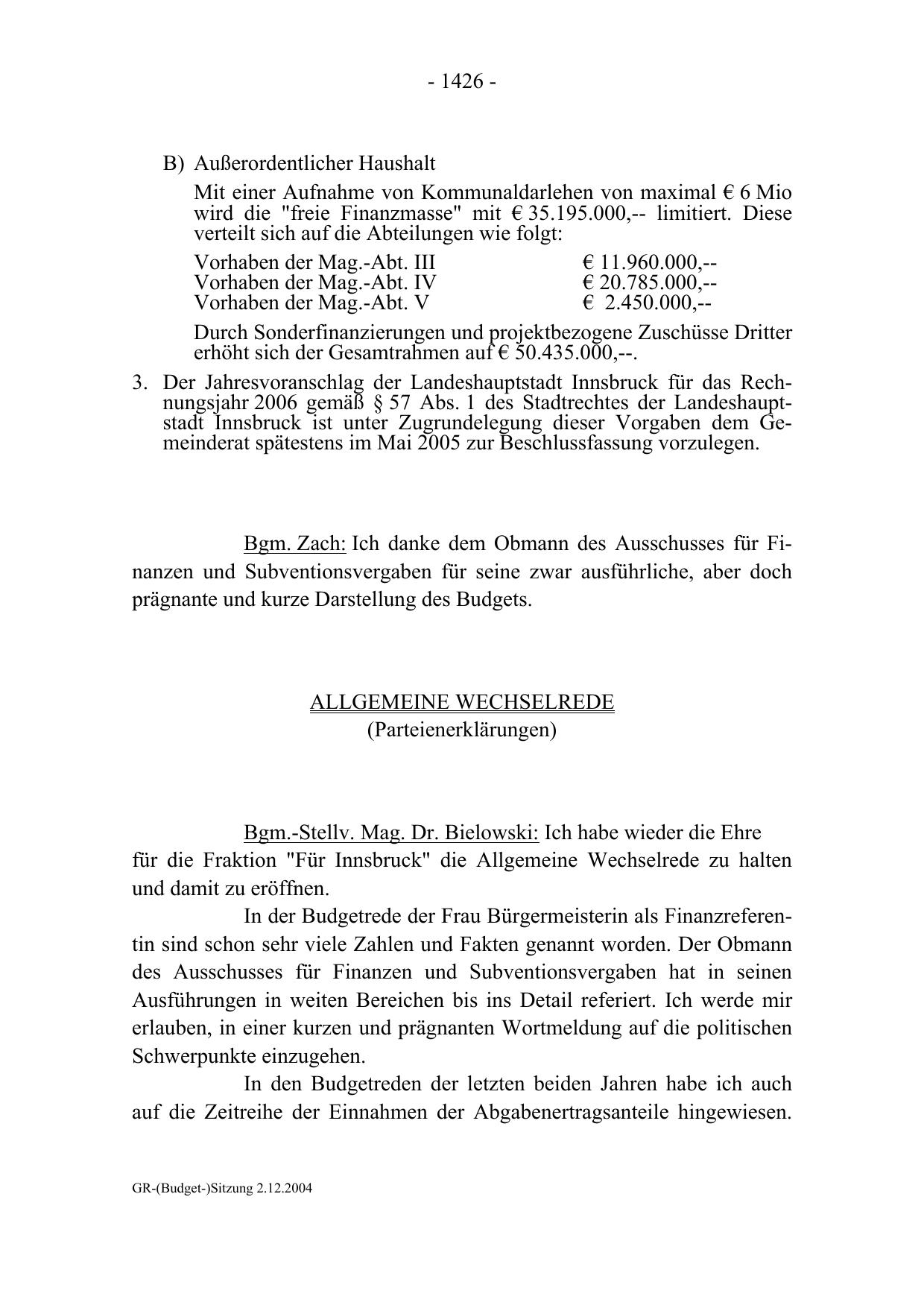 Bgm. Zach: Ich danke dem Obmann des Ausschusses für Finanzen und Subventionsvergaben für seine zwar ausführliche, aber doch