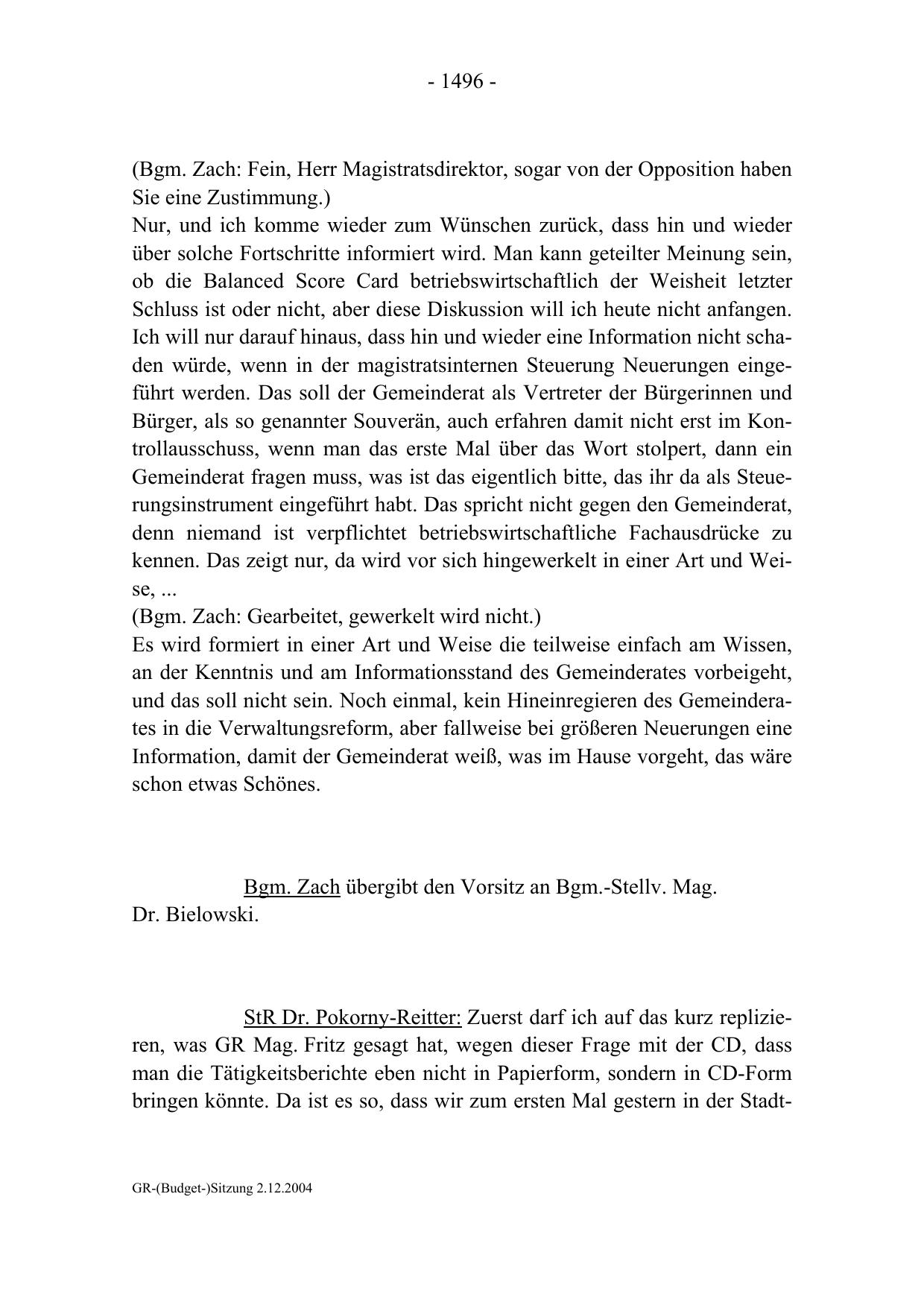 Ich will nur darauf hinaus, dass hin und wieder eine Information nicht schaden würde, wenn in der magistratsinternen Steuerung Neuerungen eingeführt werden. Das soll der Gemeinderat als Vertreter der Bürgerinnen und