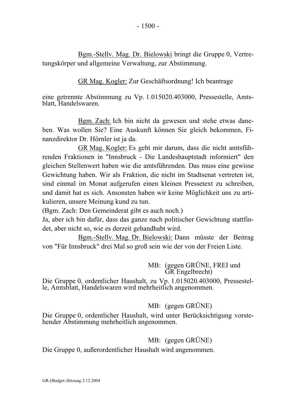 Bgm.-Stellv. Mag. Dr. Bielowski bringt die Gruppe 0, Vertretungskörper und allgemeine Verwaltung, zur Abstimmung.