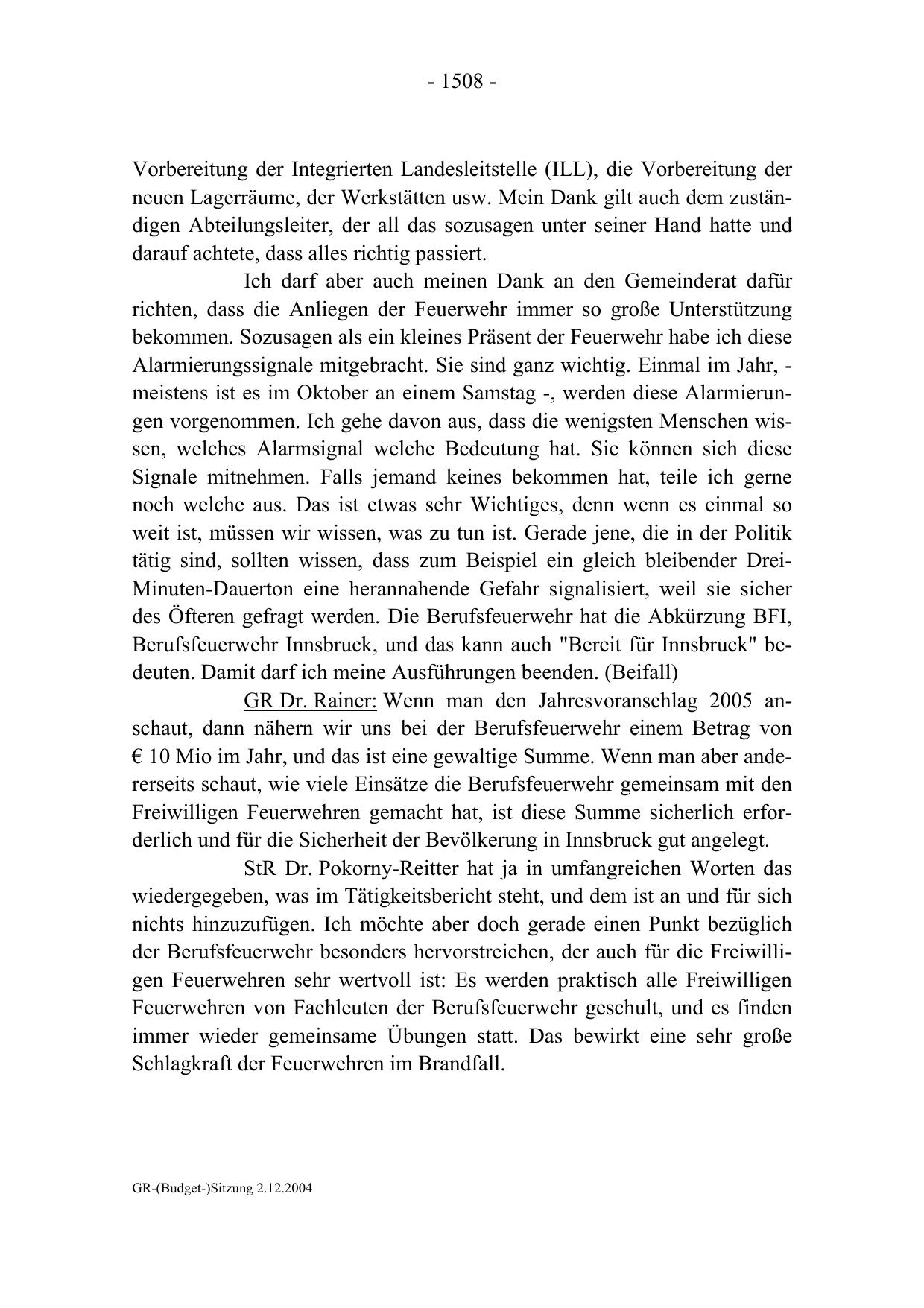 GR Dr. Rainer: Wenn man den Jahresvoranschlag 2005 anschaut, dann nähern wir uns bei der Berufsfeuerwehr einem Betrag von