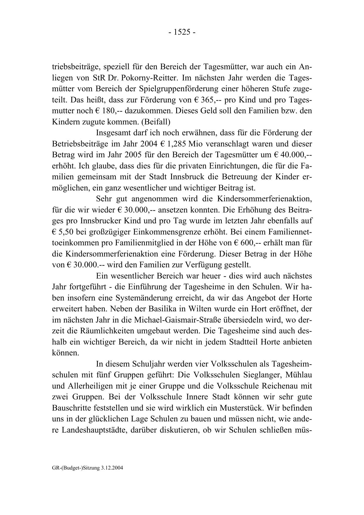 Betrag wird im Jahr 2005 für den Bereich der Tagesmütter um € 40.000,-erhöht. Ich glaube, dass dies für die privaten Einrichtungen, die für die Familien gemeinsam mit der Stadt Innsbruck die Betreuung der Kinder ermöglichen, ein ganz wesentlicher und wichtiger Beitrag ist.