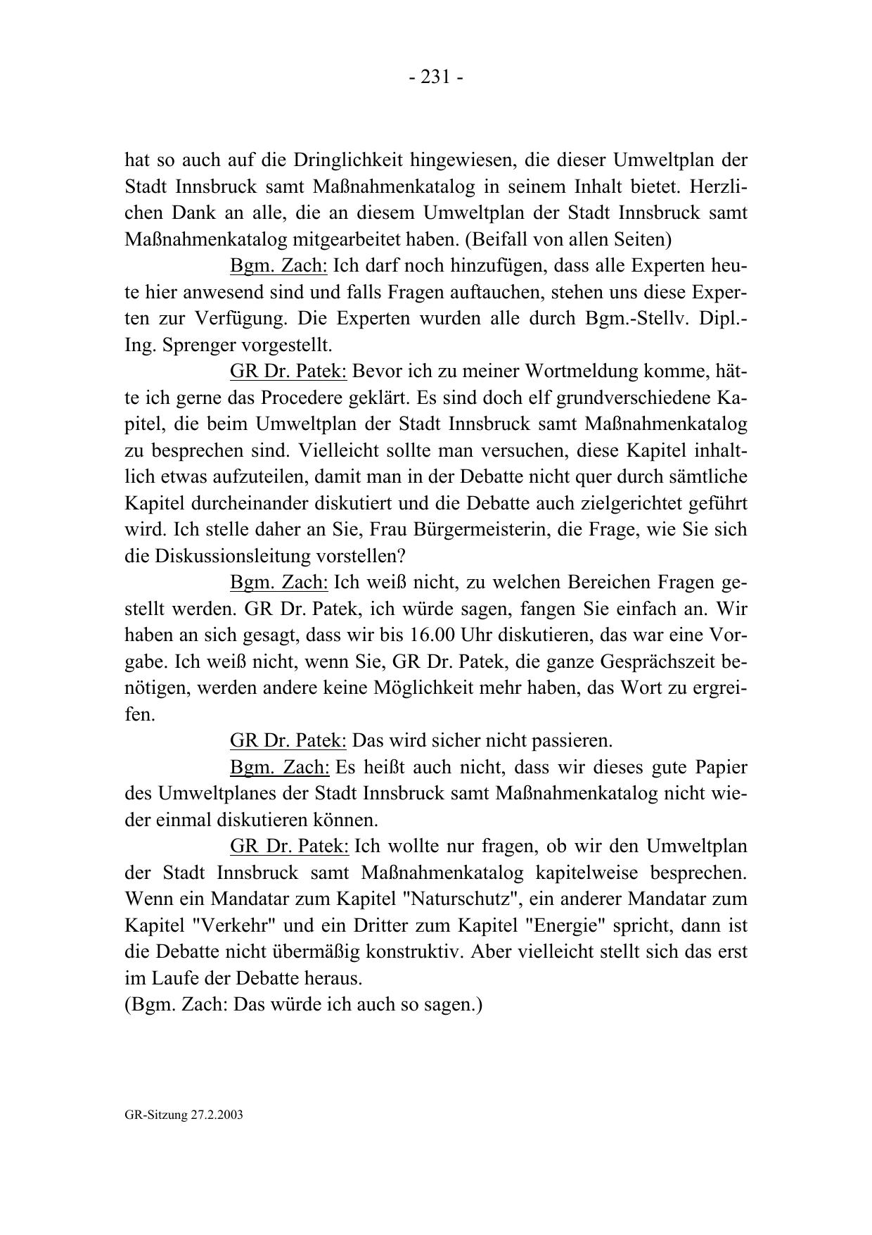GR Dr. Patek: Bevor ich zu meiner Wortmeldung komme, hätte ich gerne das Procedere geklärt. Es sind doch elf grundverschiedene Kapitel, die beim Umweltplan der Stadt Innsbruck samt Maßnahmenkatalog