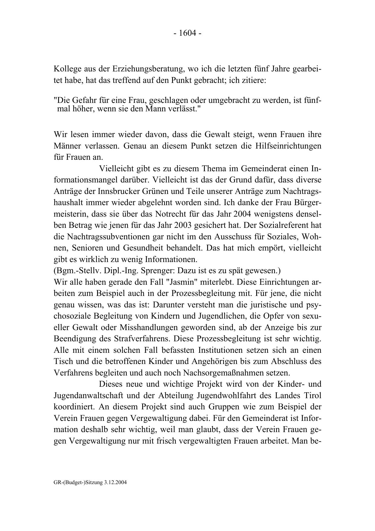 Anträge der Innsbrucker Grünen und Teile unserer Anträge zum Nachtragshaushalt immer wieder abgelehnt worden sind. Ich danke der Frau Bürgermeisterin, dass sie über das Notrecht für das Jahr 2004 wenigstens denselben Betrag wie jenen für das Jahr 2003 gesichert hat. Der Sozialreferent hat