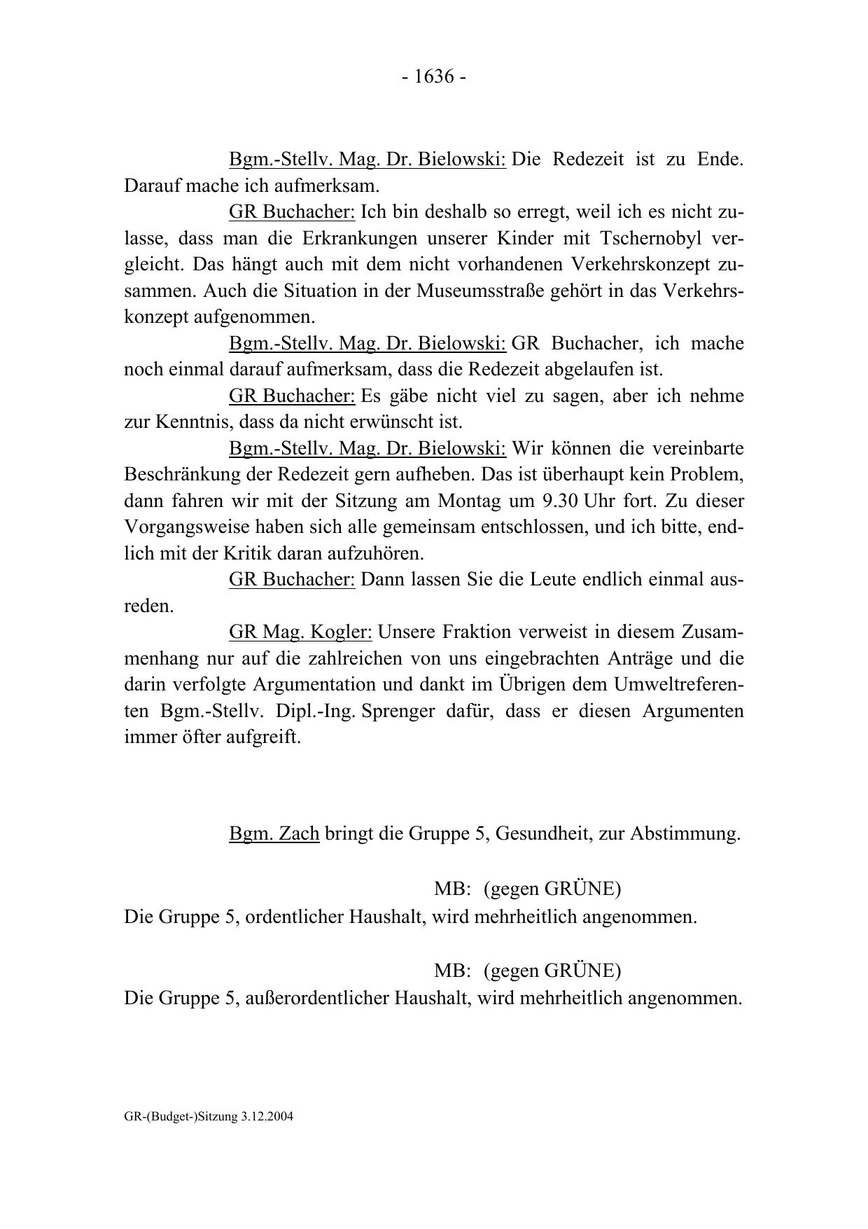 GR Buchacher: Ich bin deshalb so erregt, weil ich es nicht zulasse, dass man die Erkrankungen unserer Kinder mit Tschernobyl vergleicht. Das hängt auch mit dem nicht vorhandenen Verkehrskonzept zusammen. Auch die Situation in der Museumsstraße gehört in das Verkehrskonzept aufgenommen.