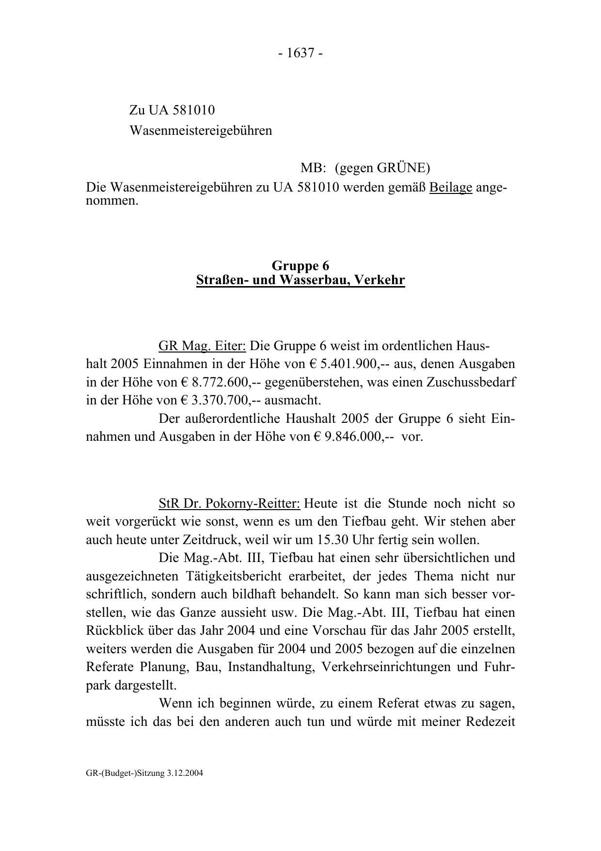 GR Mag. Eiter: Die Gruppe 6 weist im ordentlichen Haushalt 2005 Einnahmen in der Höhe von € 5.401.900,-- aus, denen Ausgaben