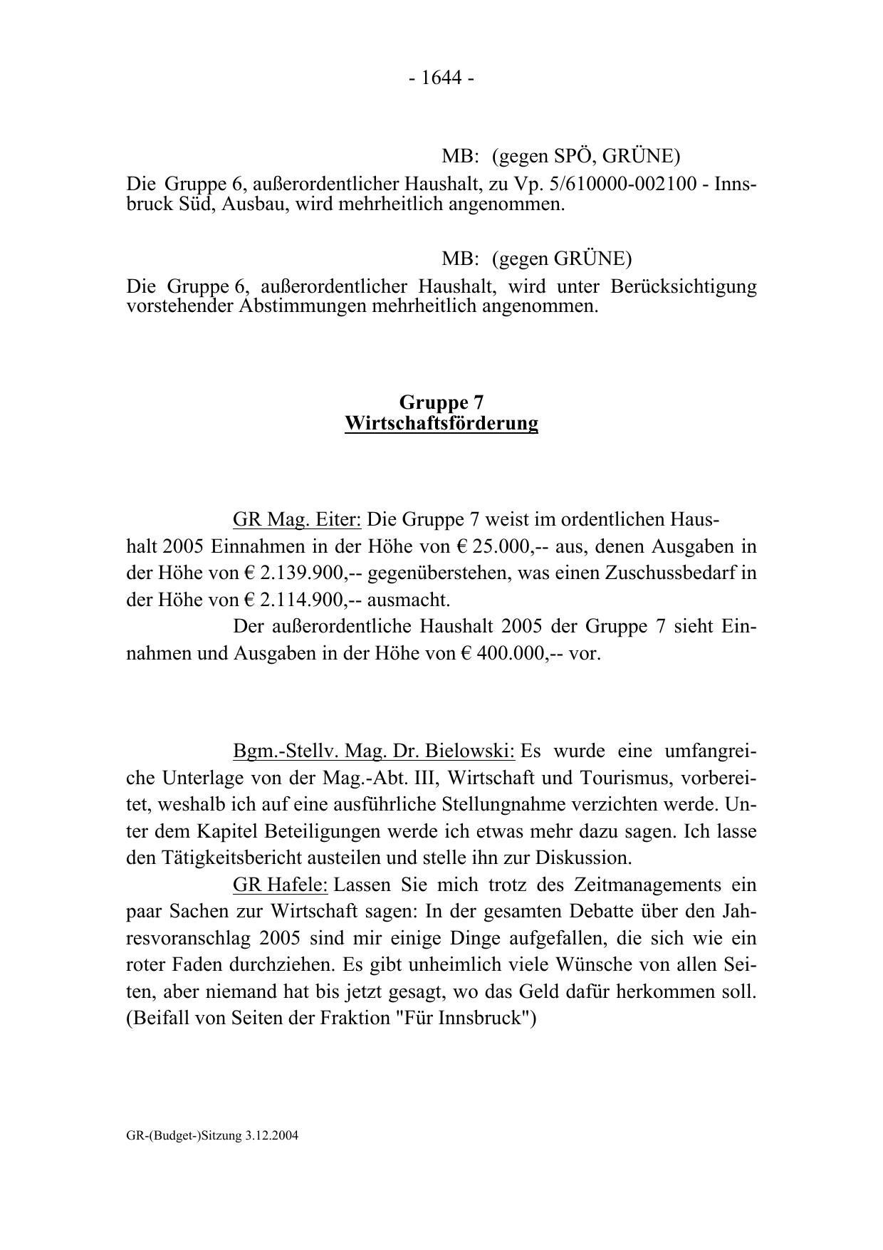 Der außerordentliche Haushalt 2005 der Gruppe 7 sieht Einnahmen und Ausgaben in der Höhe von € 400.000,-- vor.