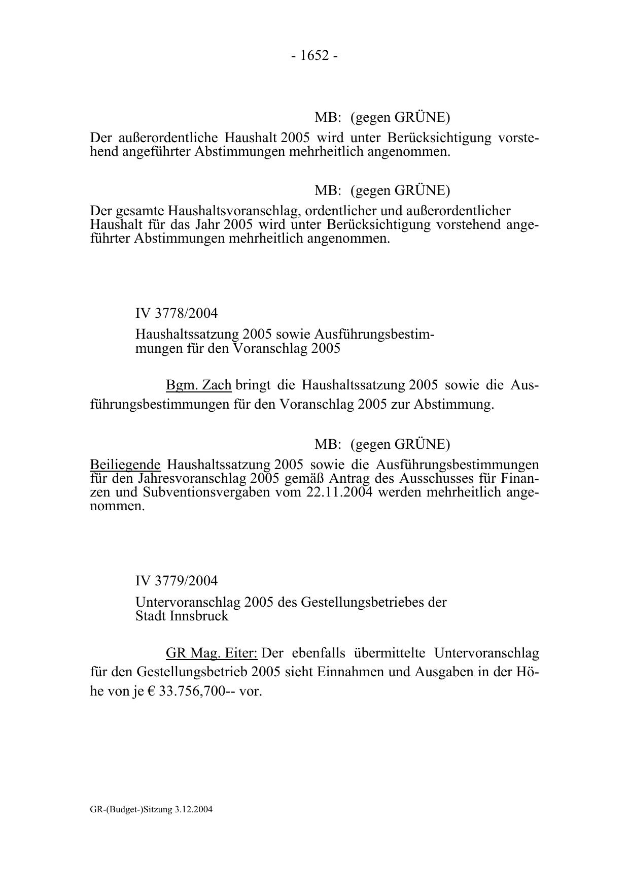 für den Jahresvoranschlag 2005 gemäß Antrag des Ausschusses für Finanzen und Subventionsvergaben vom 22.11.2004 werden mehrheitlich angenommen.