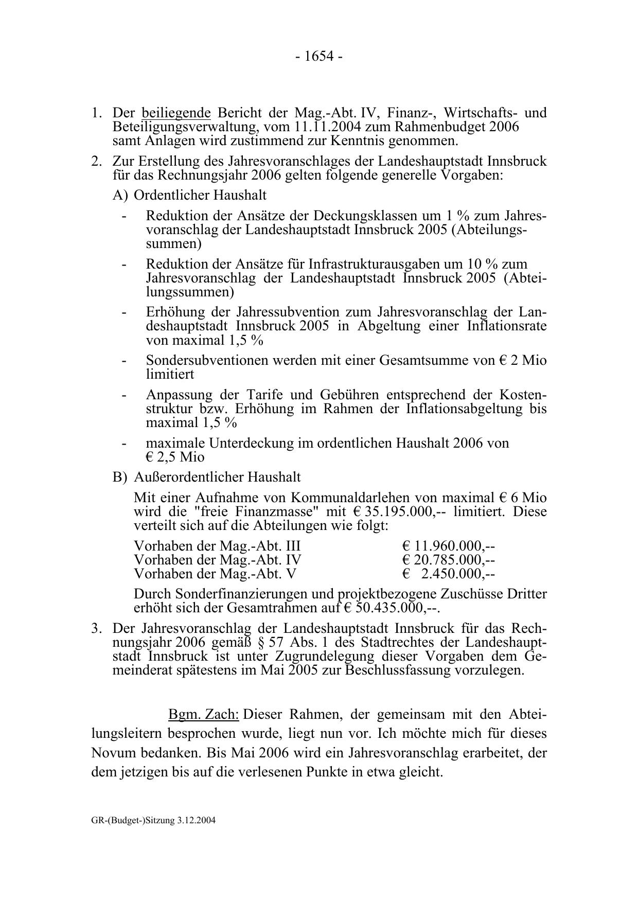 3. Der Jahresvoranschlag der Landeshauptstadt Innsbruck für das Rechnungsjahr 2006 gemäß § 57 Abs. 1 des Stadtrechtes der Landeshauptstadt Innsbruck ist unter Zugrundelegung dieser Vorgaben dem Gemeinderat spätestens im Mai 2005 zur Beschlussfassung vorzulegen.