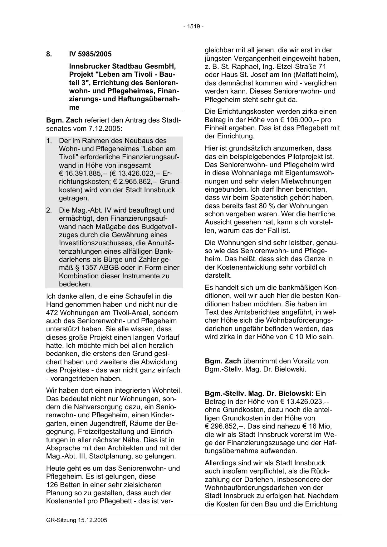 Bgm. Zach referiert den Antrag des Stadtsenates vom 7.12.2005: