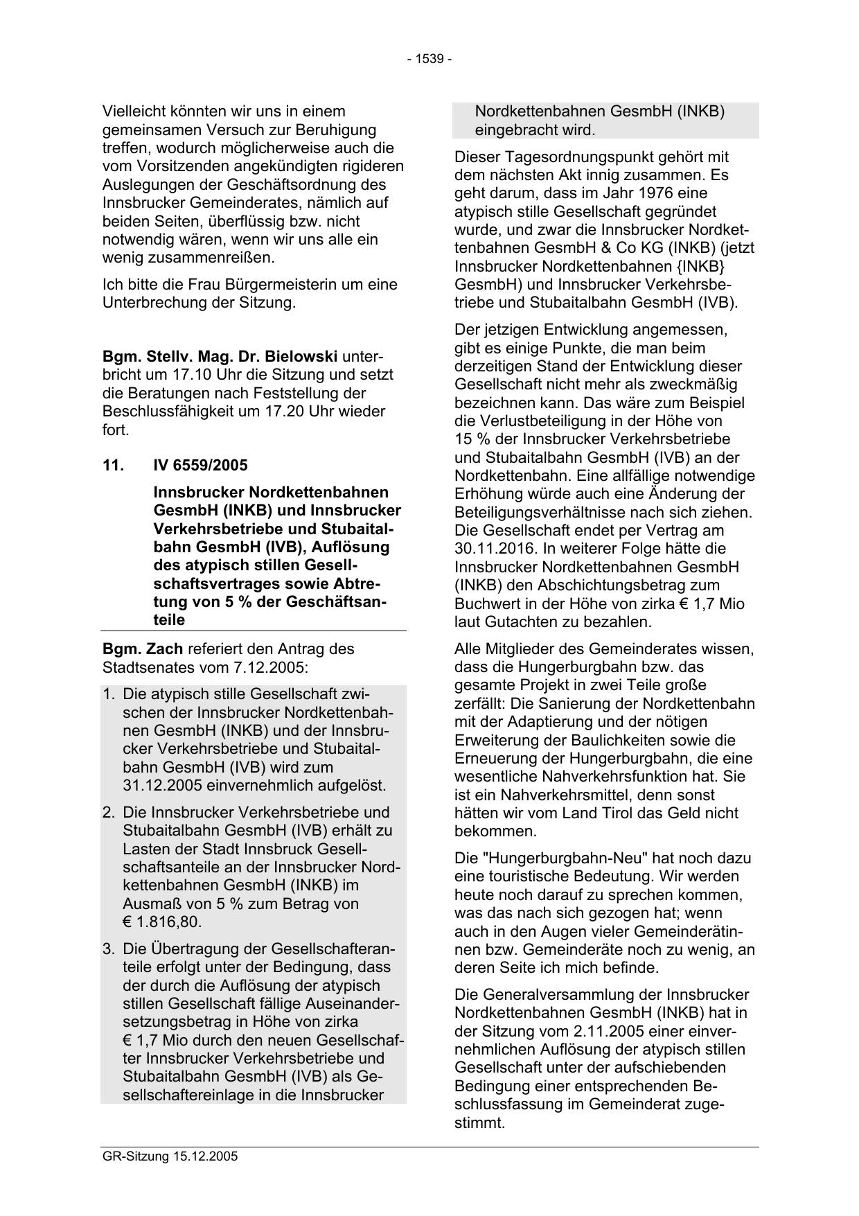 Bgm. Stellv. Mag. Dr. Bielowski unterbricht um 17.10 Uhr die Sitzung und setzt