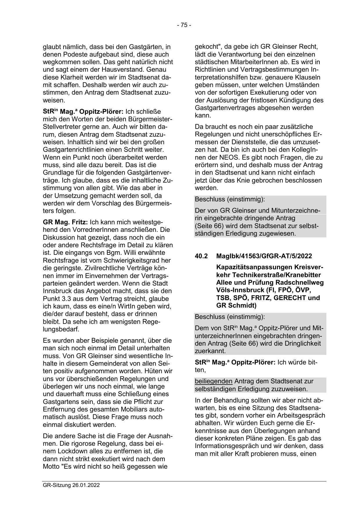 In der Behandlung sollten wir aber nicht abwarten, bis es eine Sitzung des Stadtsenates gibt, sondern vorher ein Arbeitsgespräch
