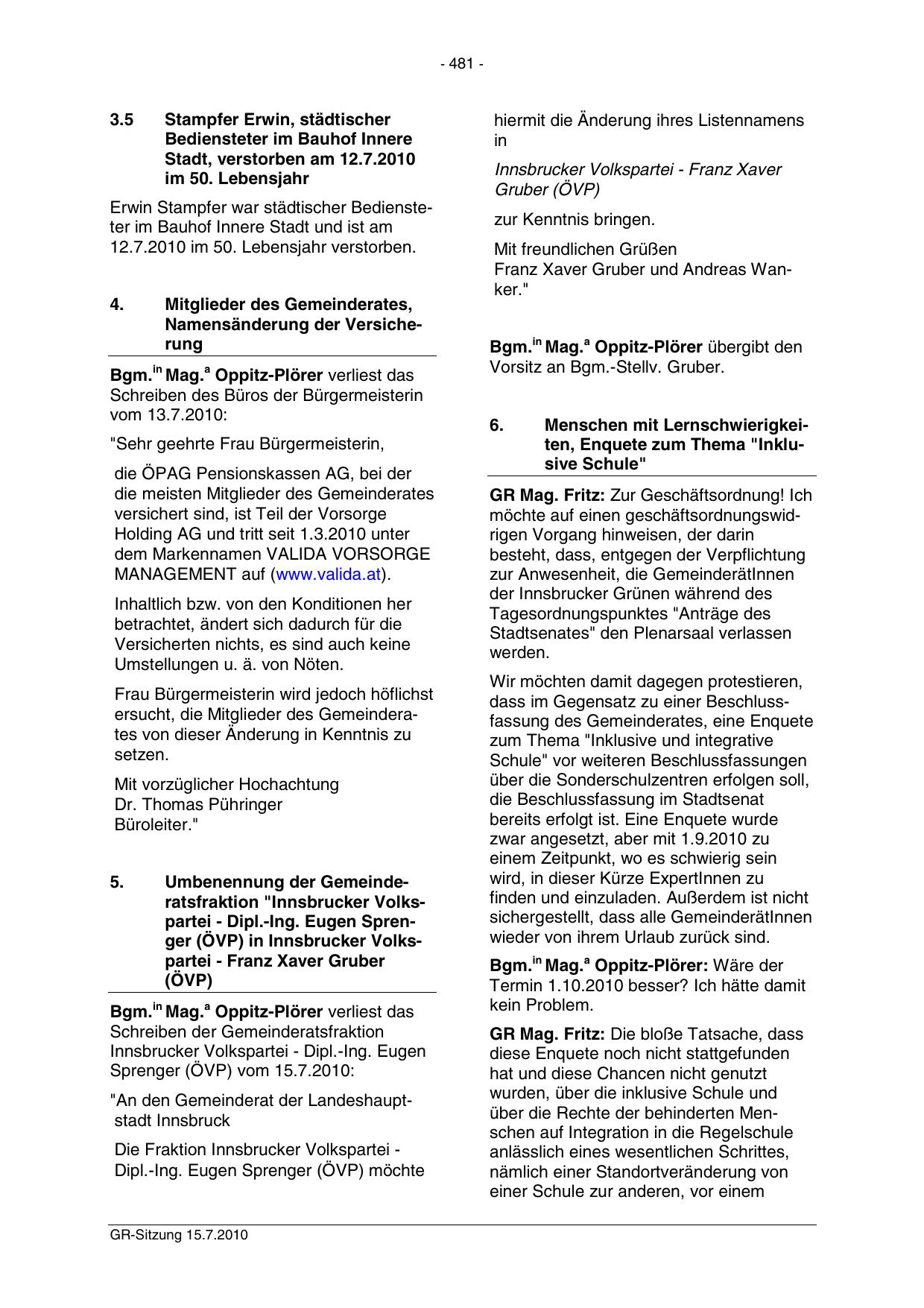 Umbenennung der Gemeinderatsfraktion "Innsbrucker Volkspartei - Dipl.-Ing. Eugen Sprenger (ÖVP) in Innsbrucker Volkspartei - Franz Xaver Gruber