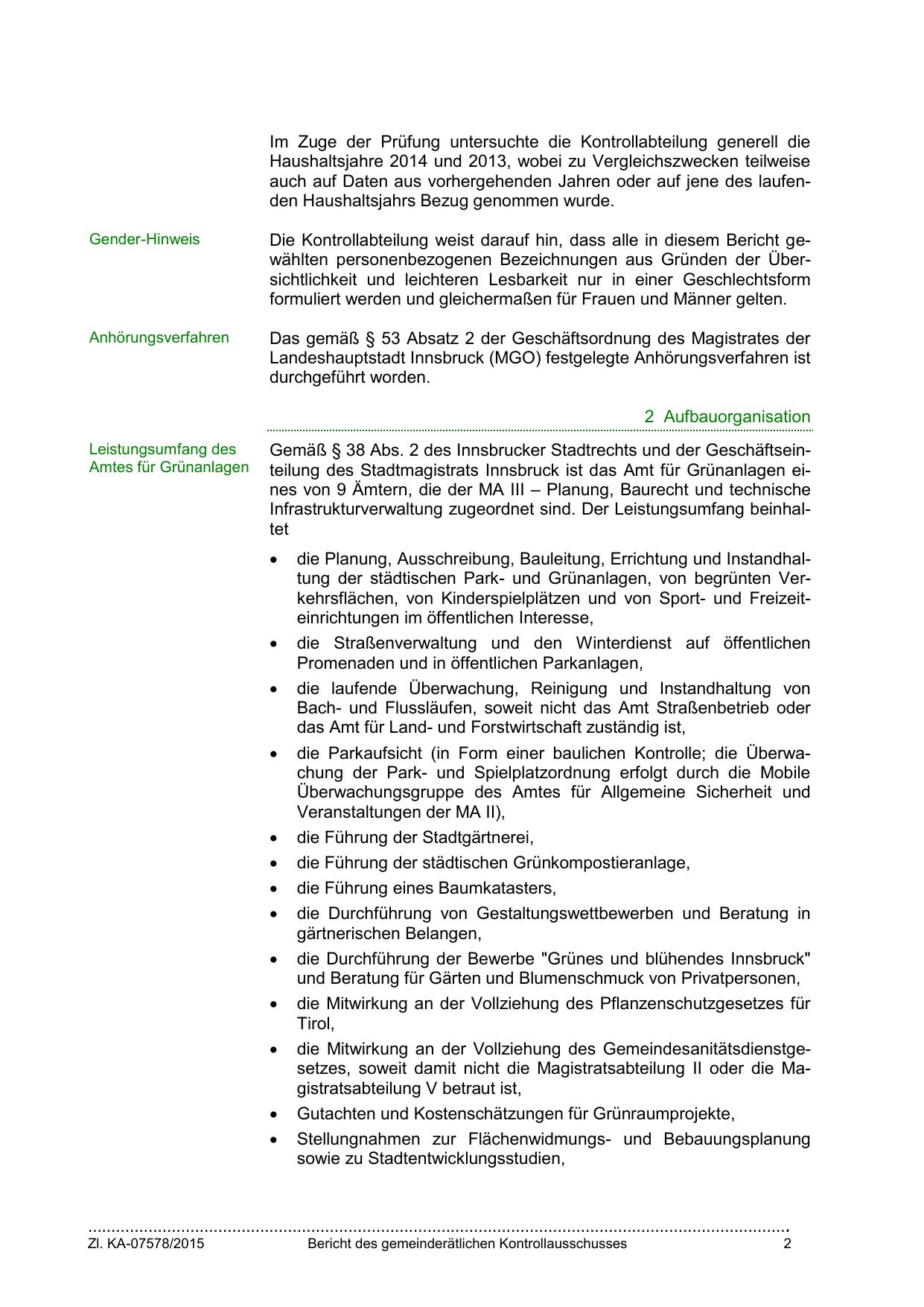 Gemäß § 38 Abs. 2 des Innsbrucker Stadtrechts und der Geschäftseinteilung des Stadtmagistrats Innsbruck ist das Amt für Grünanlagen eines von 9 Ämtern, die der MA III – Planung, Baurecht und technische