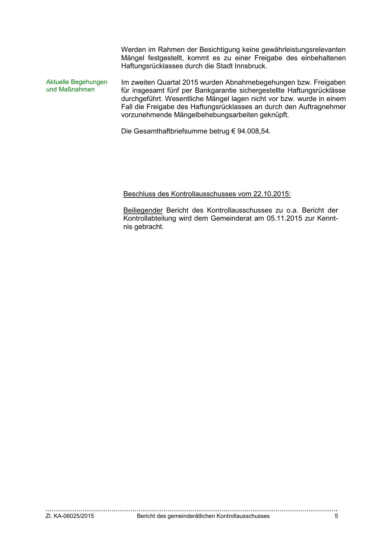Beschluss des Kontrollausschusses vom 22.10.2015: