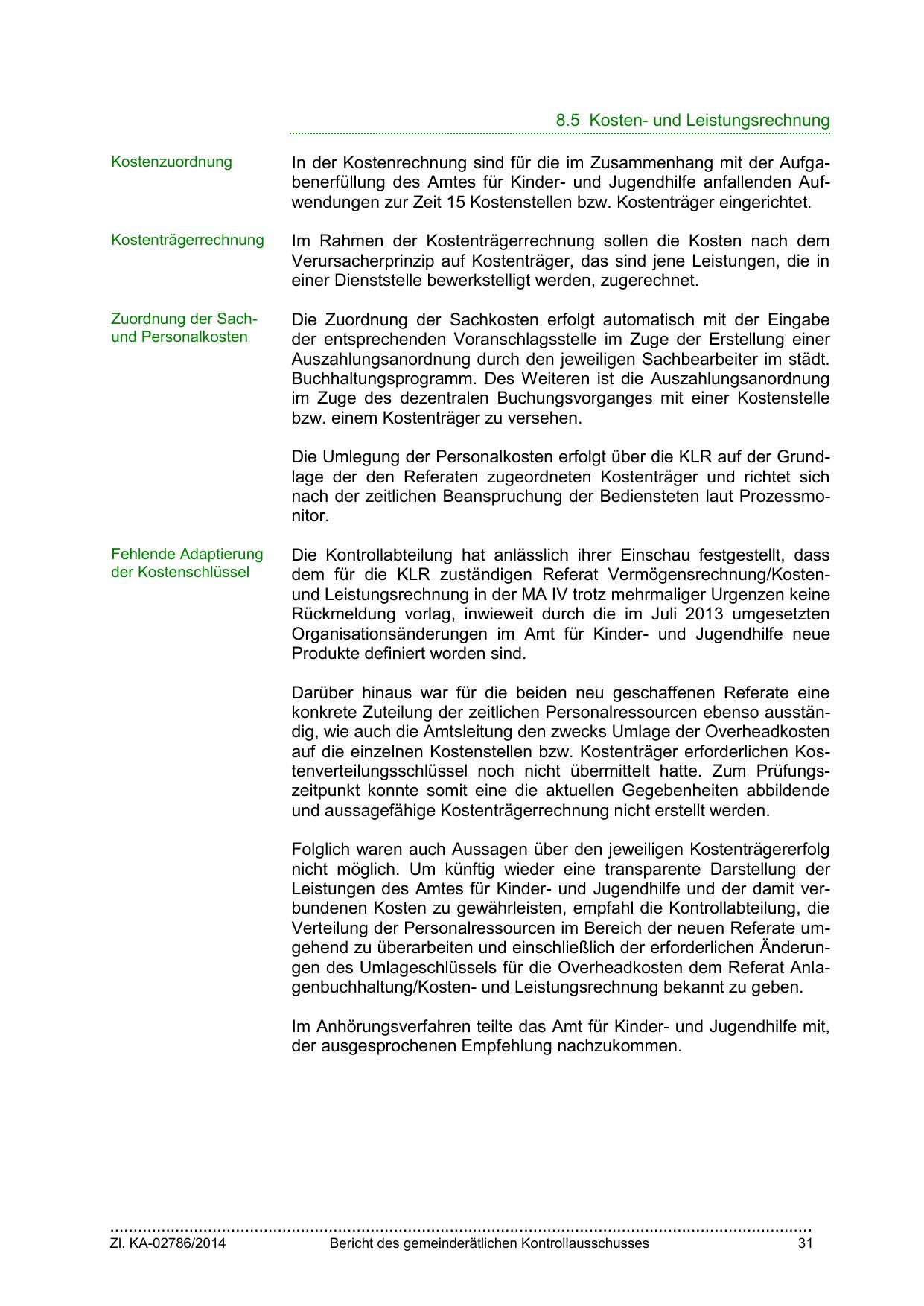 In der Kostenrechnung sind für die im Zusammenhang mit der Aufgabenerfüllung des Amtes für Kinder- und Jugendhilfe anfallenden Aufwendungen zur Zeit 15 Kostenstellen bzw. Kostenträger eingerichtet.