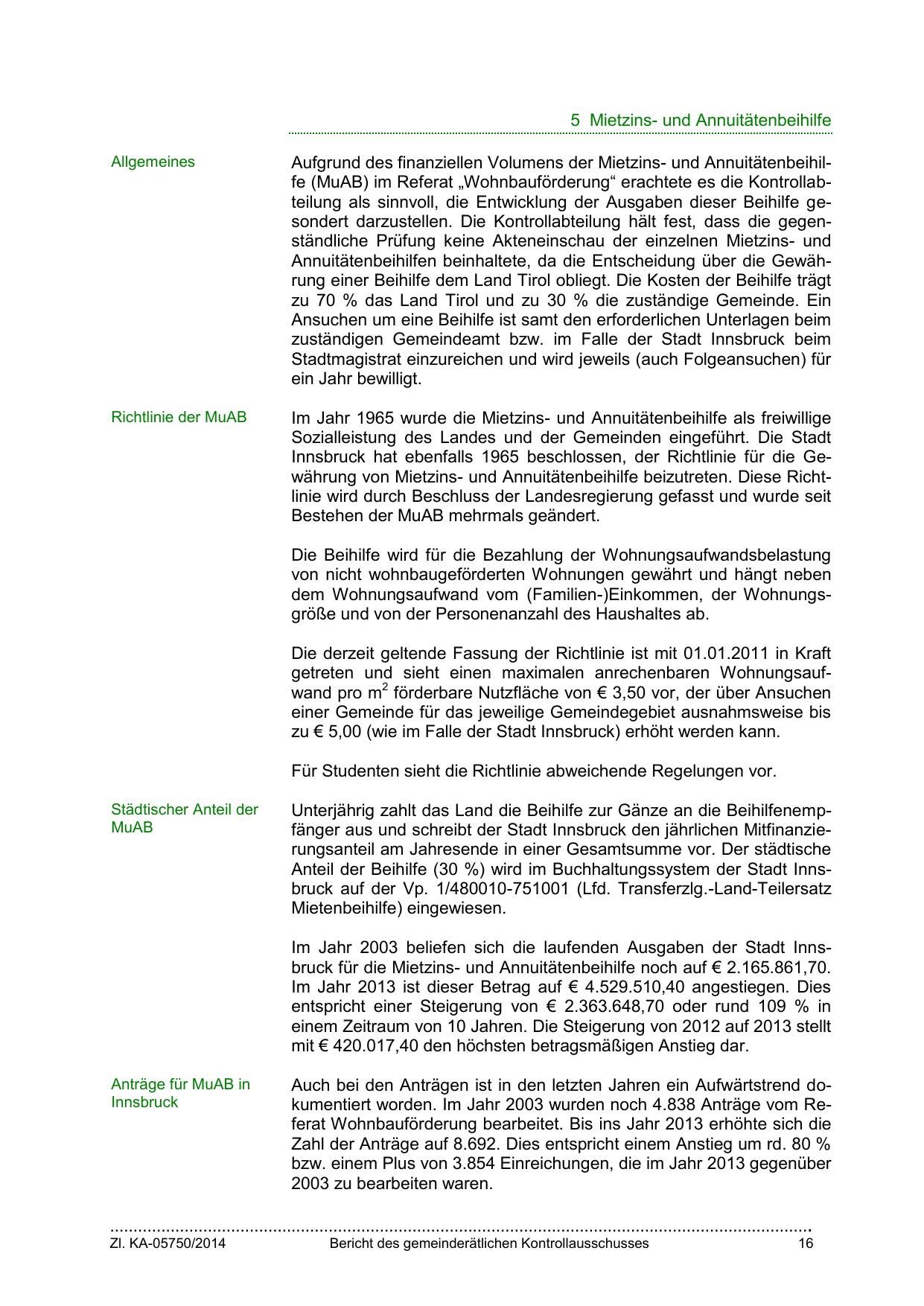 Aufgrund des finanziellen Volumens der Mietzins- und Annuitätenbeihilfe (MuAB) im Referat „Wohnbauförderung“ erachtete es die Kontrollabteilung als sinnvoll, die Entwicklung der Ausgaben dieser Beihilfe gesondert darzustellen. Die Kontrollabteilung hält fest, dass die gegenständliche Prüfung keine Akteneinschau der einzelnen Mietzins- und